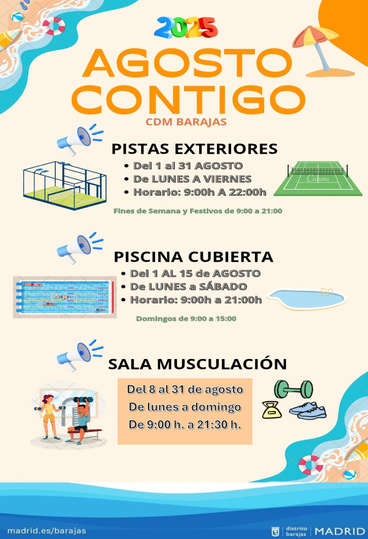 Este año, una vez más, el Centro Deportivo Municipal Barajas no colgará el cartel de «Cerrado por vacaciones». Tras la gran acogida que tuvo el año pasado la apertura de estas instalaciones durante el mes de agosto, por primera vez en su historia, para este verano se han ampliado los servicios y se han prolongado al máximo las fechas de apertura. El centro solo cerrará los días imprescindibles para llevar a cabo los trabajos anuales obligatorios de mantenimiento.