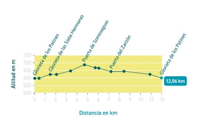 Este itinerario, que circula en su totalidad por caminos asfaltados, tiene algunas de las subidas más duras de la Casa de Campo, como la del cerro Garabitas o la del Teleférico.