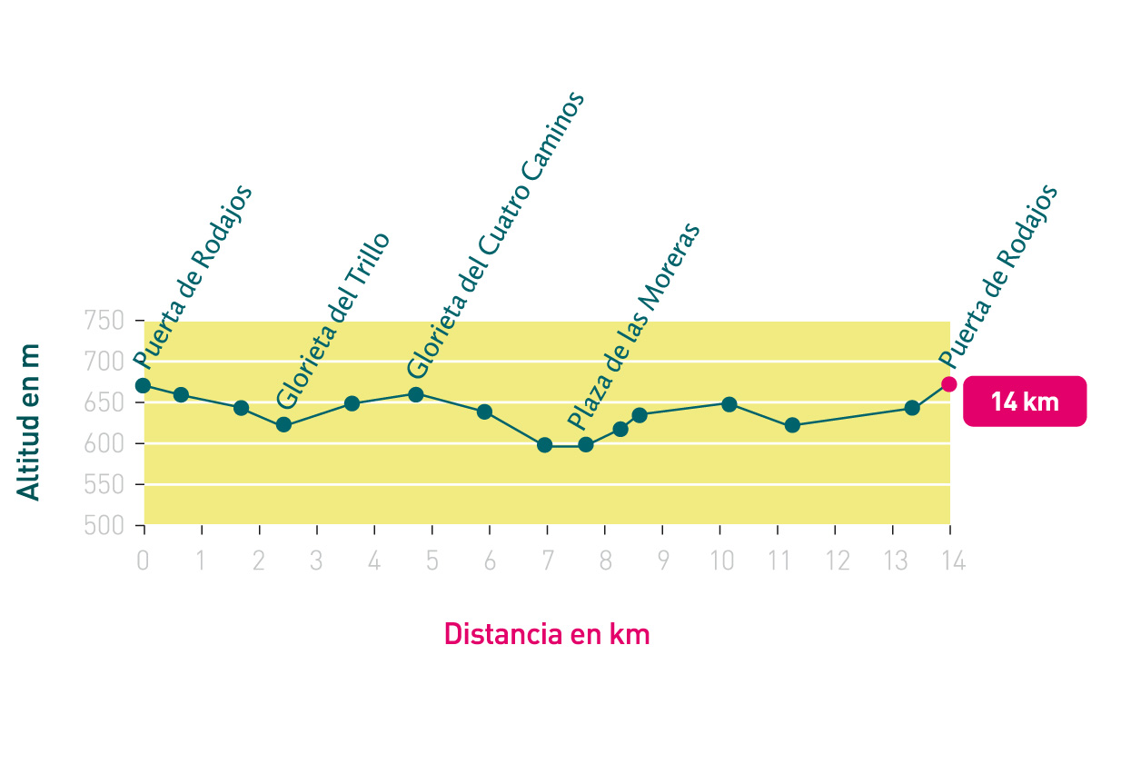 El recorrido permite, además, disfrutar de las increíbles vistas de Madrid desde los miradores y los puntos más altos. También comienza desde el aparcamiento de puerta de Rodajos y comprende dos itinerarios: Ruta básica (14 Km) y ruta con alternativa (13,20 Km). Tienen una duración de 1.45 horas aproximadamente y un desnivel de 135 m. Dificultad media.