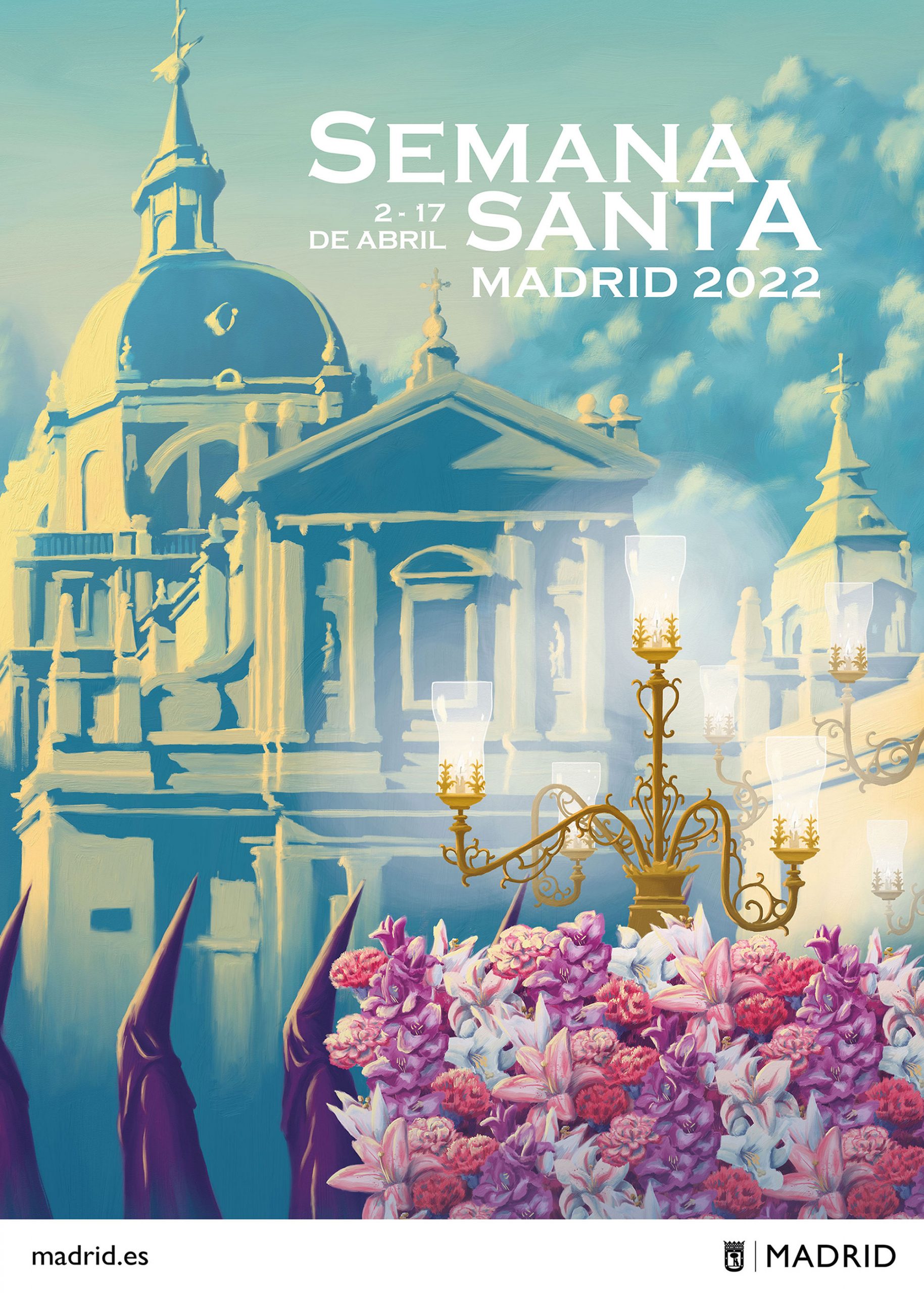 Un grupo de nazarenos acompaña a un paso engalanado con lirios, gladiolos y claveles que desfila ante la Catedral de la Almudena, una escena que juega con la luz para llevar al espectador a esa atmósfera sorprendente que se vive en las procesiones de la capital y para la que su autor, el ilustrador madrileños Kike de la Rubia, ha empleado una gama cromática muy vital, con técnicas digitales y acrílico.