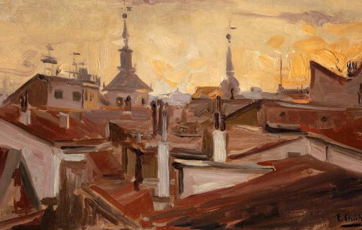 Un óleo de Enrique Martínez Cubells retrata la Puerta del Sol un día de lluvia hacia 1900, en el que los tonos plomizos, los paraguas, los coches tirados a caballo junto con los tranvías, nos recuerdan con nostalgia el ambiente parisino.