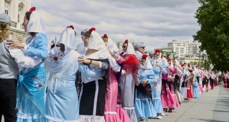 Parejas con el traje típico de Madrid bailando chotis en las fiestas de San Isidro (Madrid Destino)