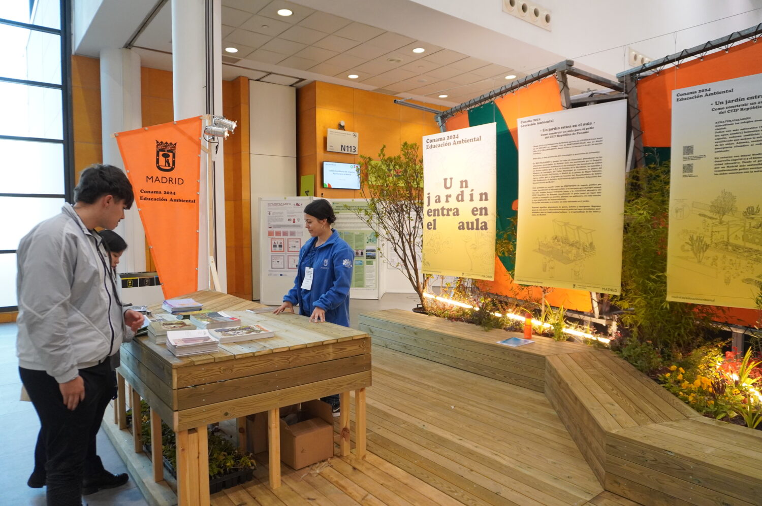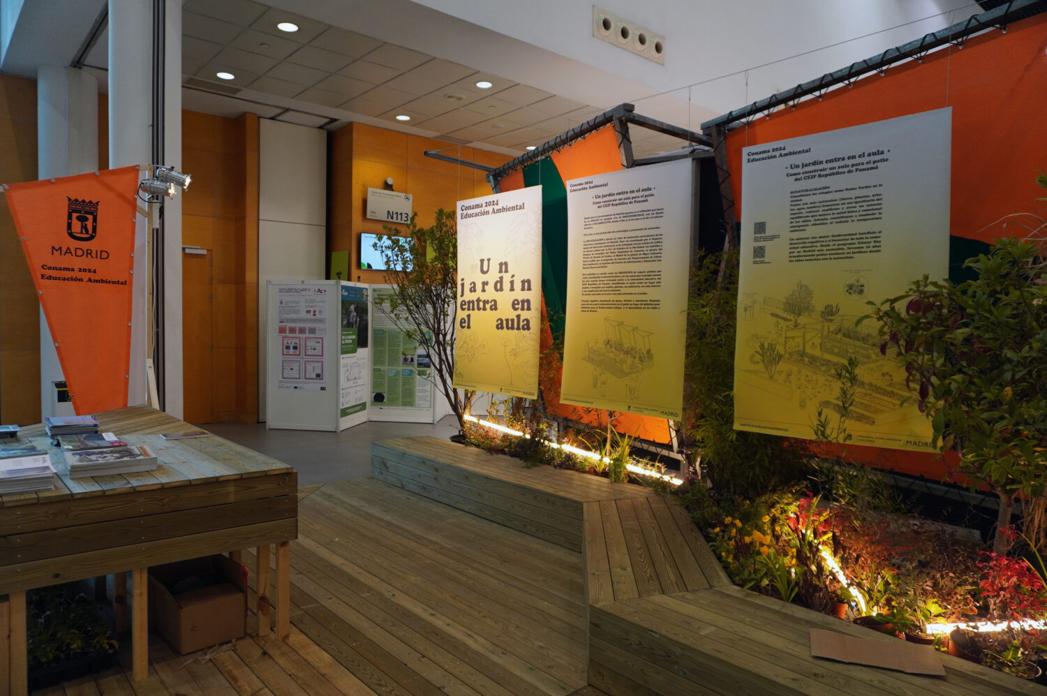 Desde 2012 el Ayuntamiento de Madrid y CONAMA (Congreso Nacional de Medio Ambiente, el principal evento anual de su tipo en España) han tejido diálogos ambientales a través del estand municipal, ejemplo de aprovechamiento al máximo de recursos, en sostenibilidad con residuo 0 y en la reutilización de materiales procedentes de los almacenes del Ayuntamiento. El estand de la edición 2024 de CONAMA se construyó en su día con la suma de restos de señales de tráfico, plantas del Vivero de Estufas del Retiro, alfombrado de cortezas de pino de la planta de compostaje de Migas Calientes y bloques de hormigón del Taller de Cantería. Pero lo más valioso ha sido el uso posterior del estand, que ha quedado listo para una provechosa segunda vida en el patio del CEIP República de Panamá (San Blas-Canillejas) como recurso educativo, un aula jardín.
