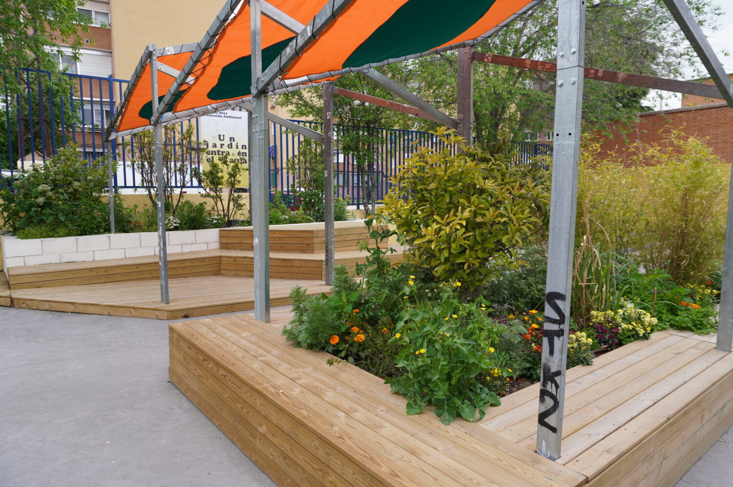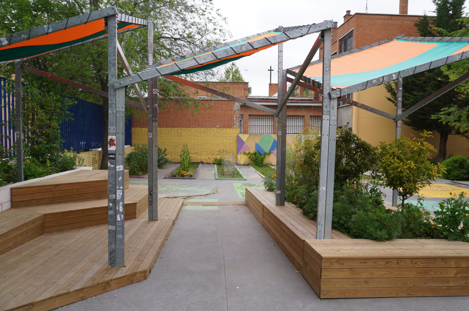 Con esto, tenemos un jardín hecho aula para integrar la educación ambiental dentro del espacio de descanso escolar. El pabellón se concibió como un prototipo de espacio público por llegar, tal vez futurista, pensado entre todos, especialmente por la comunidad educativa del colegio, imaginando el patio escolar como un lugar más amable y tranquilo con sombras, plantas, anfiteatro, aula exterior y prolongación del huerto existente.