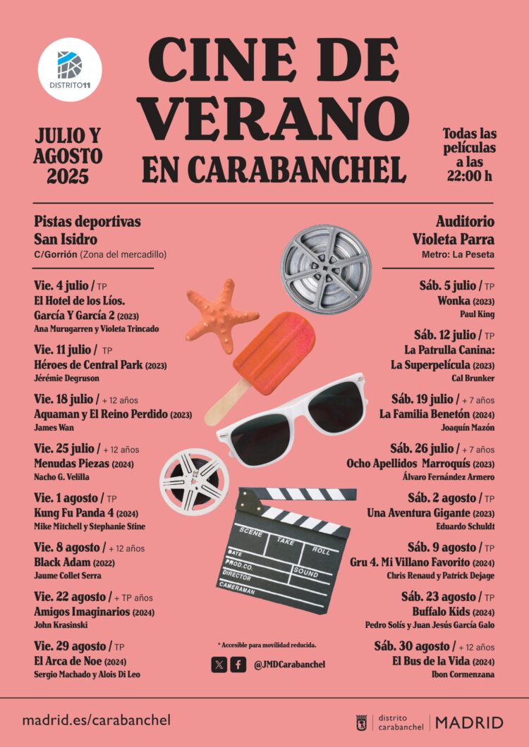 Del 5 de julio al 30 de agosto, el cine llega a espacios emblemáticos del distrito: explanada del Ensanche, Auditorio Municipal Las Trece Rosas, parque de Santa Eugenia, Auditorio Municipal al aire libre Lola Camarena. Las sesiones comenzarán a las 22:00 h, cuando cae el sol, para aprovechar el frescor de la noche. Desde grandes estrenos familiares como Gru 4 o Kung Fu Panda 4, hasta propuestas más independientes como Volveréis o Segundo premio forman parte del cartel.