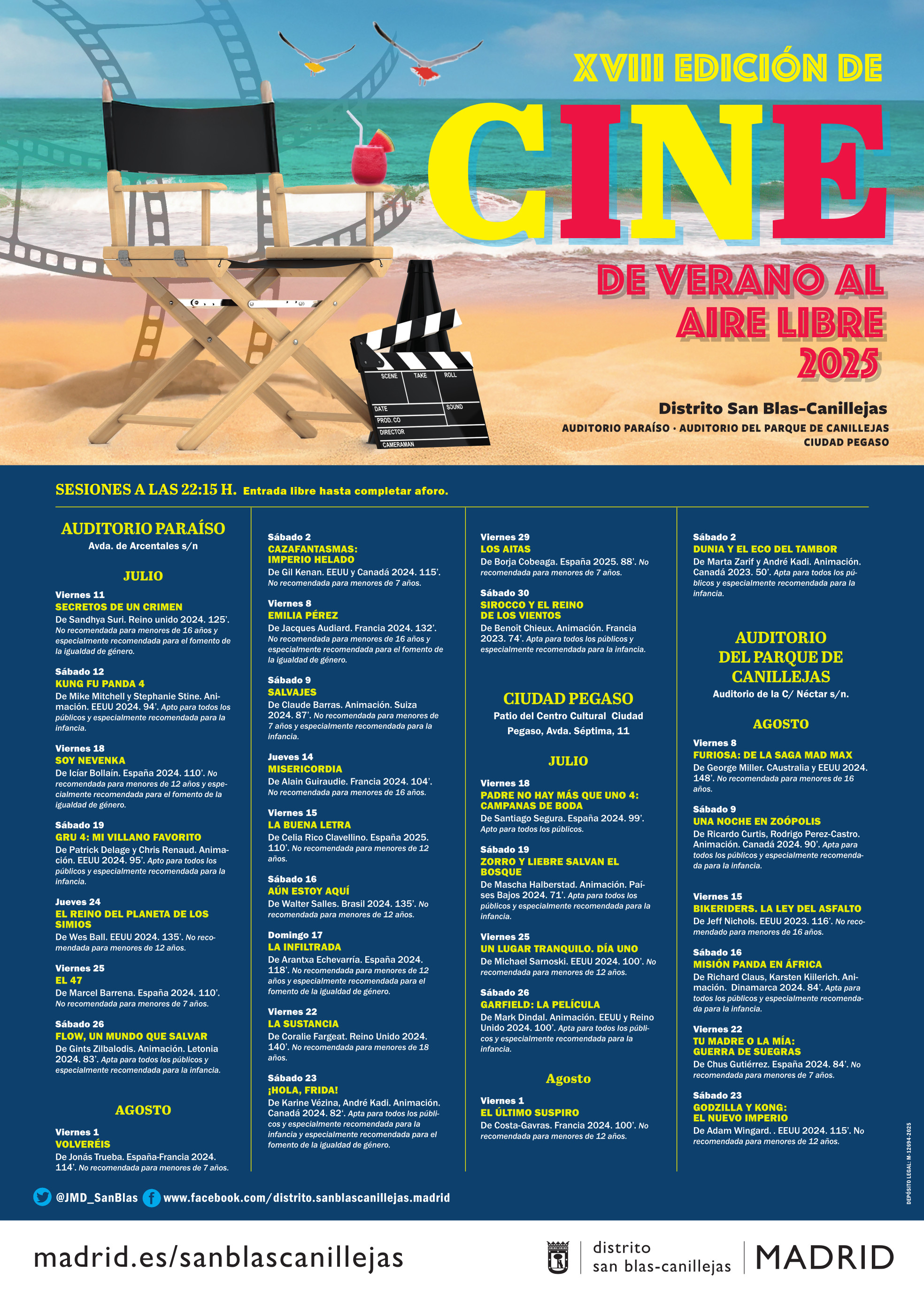 Del 5 de julio al 30 de agosto, el cine llega a espacios emblemáticos del distrito: explanada del Ensanche, Auditorio Municipal Las Trece Rosas, parque de Santa Eugenia, Auditorio Municipal al aire libre Lola Camarena. Las sesiones comenzarán a las 22:00 h, cuando cae el sol, para aprovechar el frescor de la noche. Desde grandes estrenos familiares como Gru 4 o Kung Fu Panda 4, hasta propuestas más independientes como Volveréis o Segundo premio forman parte del cartel.