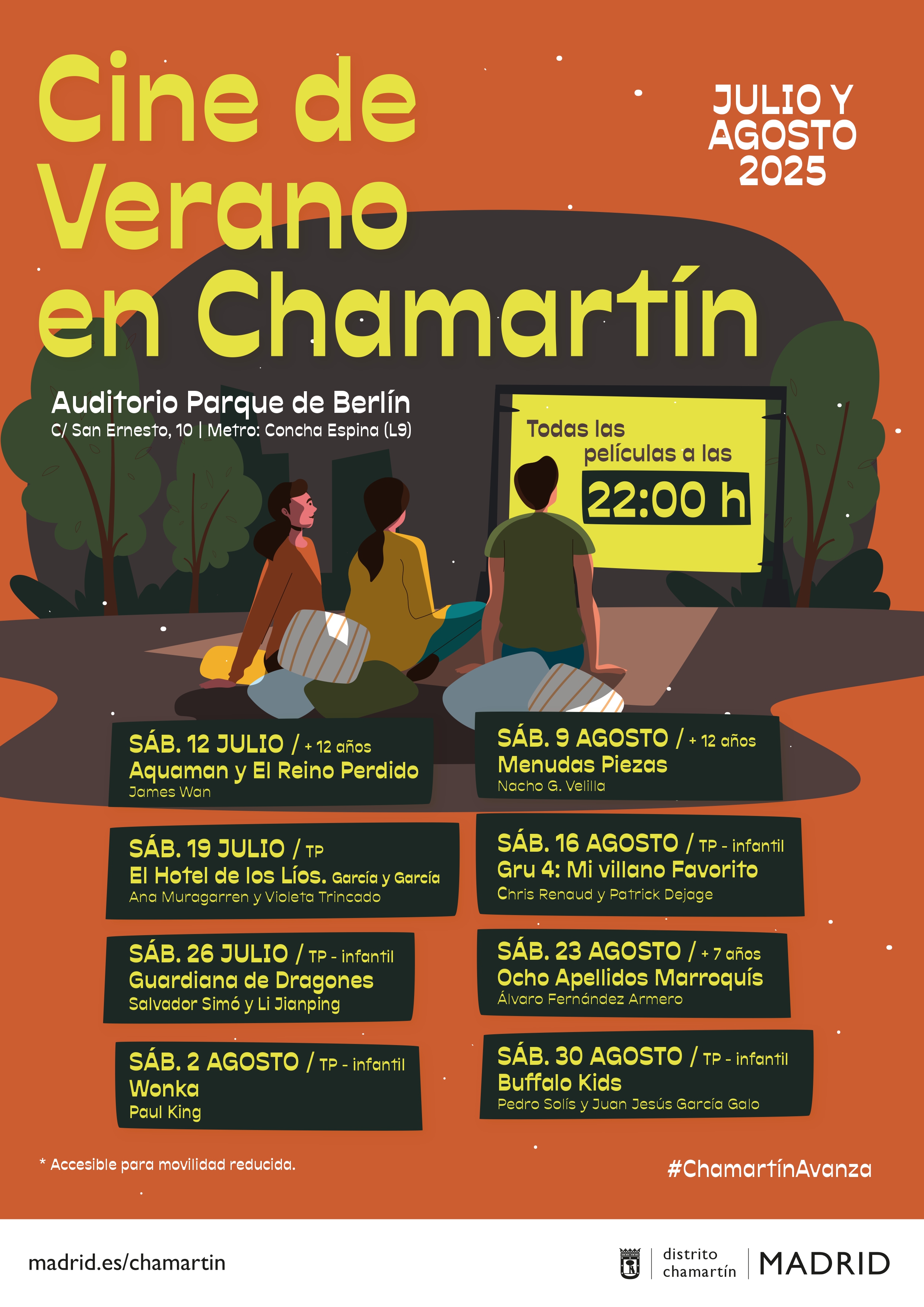 El Cine de Verano de Chamartín se celebrará en el Parque de Berlín los sábados de julio y agosto a las 22:00 h. El programa empieza el sábado 12 de julio con la cinta de superhéroes de DC Comics, Aquaman y el Reino Perdido, dirigida por James Wan. Continuará con películas como el Hotel de los líos, Wonka, Gru 4: Mi Villano Favorito o Buffalo Kids.