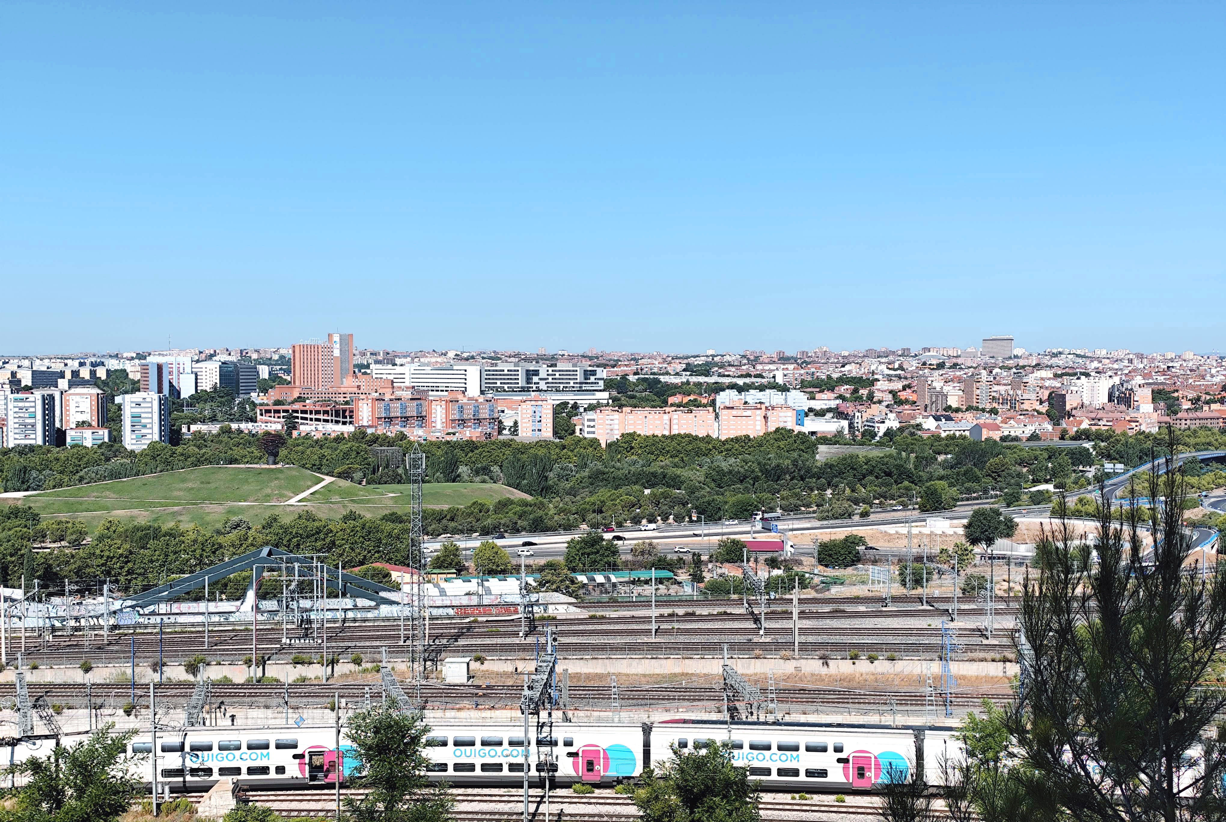 Desde este mirador se pueden disfrutar unas vistas con un contraste único: el verdor del parque extendiéndose hacia el horizonte y, junto a él, la superficie de La Almudena, el mayor cementerio de Europa occidental, donde reposan más personas que las que hoy habitan Madrid.