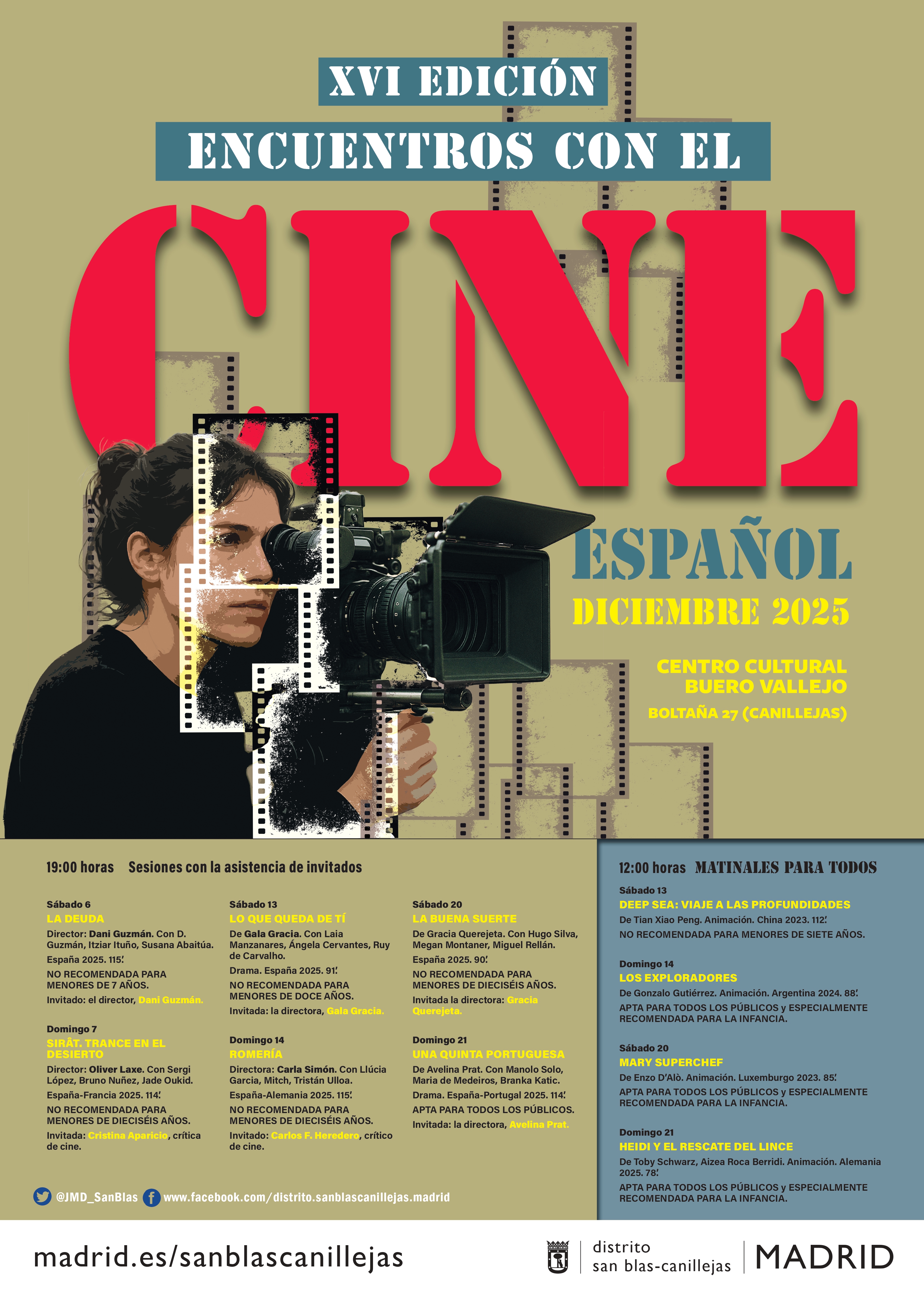 Del sábado 6 al domingo 21 de diciembre, el Centro Cultural Buero Vallejo acoge la XVI edición de los Encuentros con el Cine Español, un evento que combina proyecciones de películas recientes con la participación de directores, críticos y otros invitados del sector cinematográfico. Además, la programación se divide en dos franjas horarias: sesiones con invitados a las 19:00 horas y matinales para todos a las 12:00 horas.