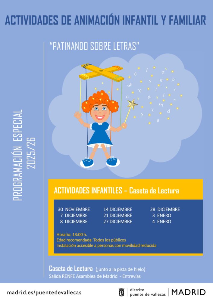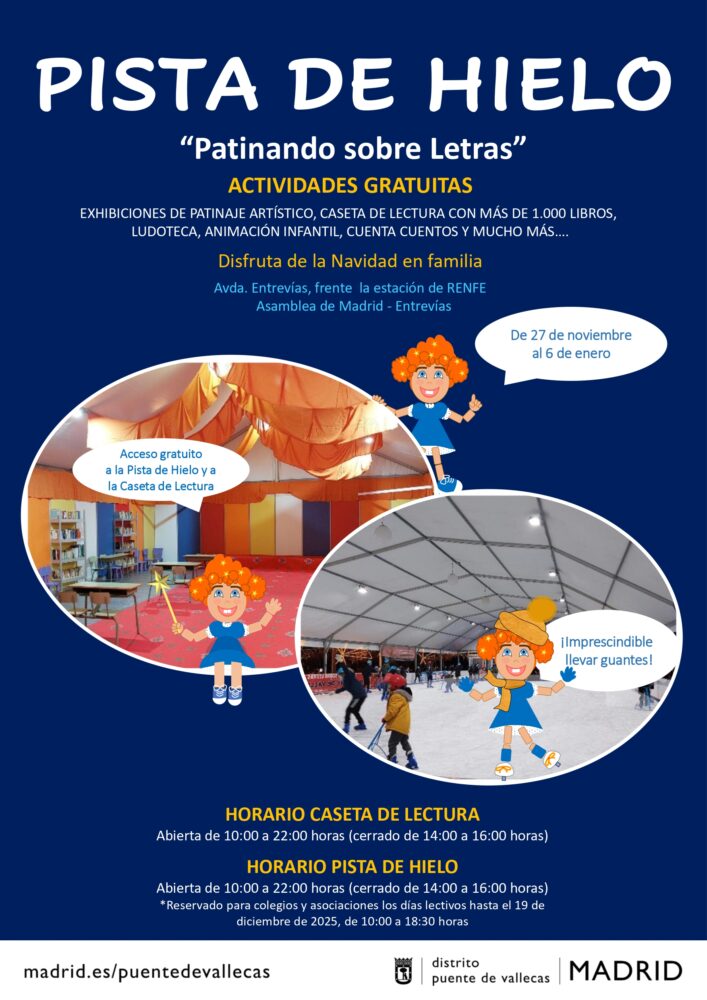 Del 27 de noviembre al 6 de enero, la avenida de Entrevías (junto a la salida de Renfe Asamblea de Madrid-Entrevías) acoge una de las propuestas más especiales: una pista de hielo gratuita, que se complementa con una caseta de lectura con más de 1.000 libros, ludoteca, cuentacuentos, animación infantil y exhibiciones de patinaje artístico.