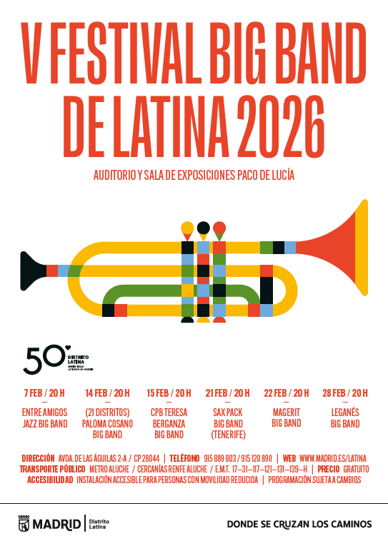 Este sábado comienza el V Festival Big Band de Latina 2026 con la actuación de Entre Amigos Jazz Big Band, un plan musical que se suma a la agenda a la programación cultural del fin de semana. Por quinto año consecutivo, el distrito de Latina ofrece la oportunidad de disfrutar durante el mes de febrero de algunas de las mejores agrupaciones de jazz en directo. A lo largo de tres semanas, seis formaciones permitirán a los aficionados al género acercarse al jazz en gran formato a través de distintas actuaciones.