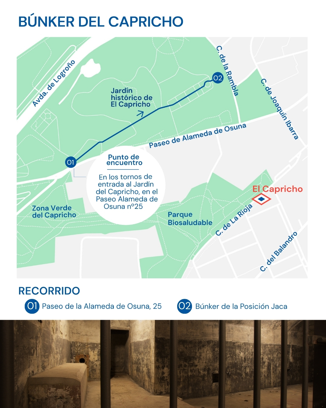 El búnker del Capricho es, probablemente, una de las visitas más impactantes y singulares de todo el programa Pasea Madrid. Construido en 1937 como parte del Cuartel General del Ejército del Centro de la II República, este refugio militar permite acercarse a un patrimonio menos conocido, pero fundamental para comprender la historia reciente de Madrid.