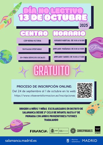 El campamento tendrá lugar en el Colegio de Educación Infantil y Primaria Reina Victoria en horario de 9:00 a 16:00 horas y oferta un total de 150 plazas, 30 de ellas para niños en situación de vulnerabilidad derivados de Servicios Sociales. También habrá un horario ampliado de mañanas, de 8:00 a 9:00 h, y de tarde, de 16:00 a 17:00 h, para aquellos que lo soliciten dentro del periodo de inscripción online, que terminará el 1 de octubre. La publicación de los listados provisionales se realizará el 6 de octubre en www.madrid.es/salamanca. /