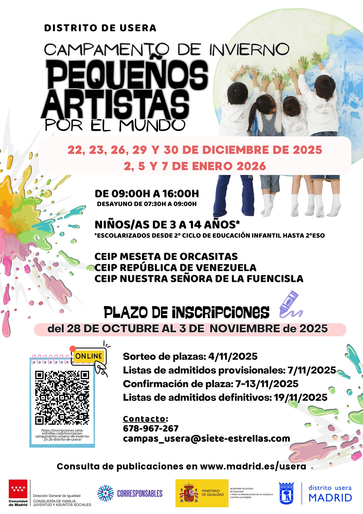 La Junta de Usera organiza campamentos urbanos estas Navidades para facilitar la conciliación de las familias del distrito en los días no lectivos. Esta propuesta es una iniciativa de los departamentos de Servicios Sociales y de Educación de la junta municipal y está destinada a niños desde los 3 años (escolarizados en segundo ciclo de Educación Infantil durante el presente curso) hasta los 14 (escolarizados en el segundo curso de ESO), así como a menores nacidos entre 2012 y 2022, ambos incluidos.