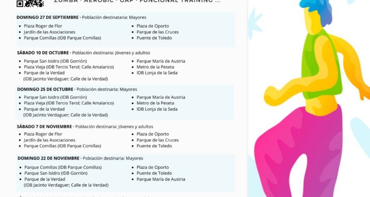 Los sábados y domingos, del 27 de septiembre al 29 de noviembre, si el tiempo no lo impide, se impartirán sesiones de carácter deportivo como aeróbic, zumba, gap y funcional training conducidas por monitores. La asistencia será libre hasta completar aforo. Sus destinatarios son grupos de población diferenciados, jóvenes, adultos y mayores, y todos deberán mantener las debidas medidas de seguridad y distancia.