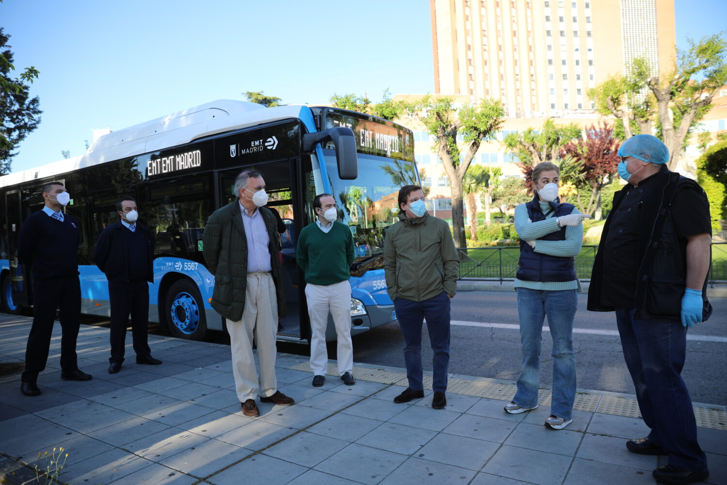 El alcalde de Madrid, José Luis Martínez-Almeida, acompañado del delegado del Área de Medio Ambiente y Movilidad, Borja Carabante, y del director general de Humanización y Atención al Paciente de la Comunidad de Madrid, Alberto Tomé, ha agradecido esta mañana desde el Hospital 12 de Octubre a los voluntarios de la Empresa Municipal de Transportes de Madrid (EMT) la “encomiable labor” que realizan desde el pasado 30 de marzo al trasladar a los profesionales sanitarios desde los hoteles donde se alojan hasta los centros hospitalarios donde combaten al coronavirus. Este servicio que prestan a la ciudad, ha recordado Almeida, “lo hacen de manera altruista” y cada vez son más los empleados de la empresa pública que quieren contribuir a dar esta asistencia.