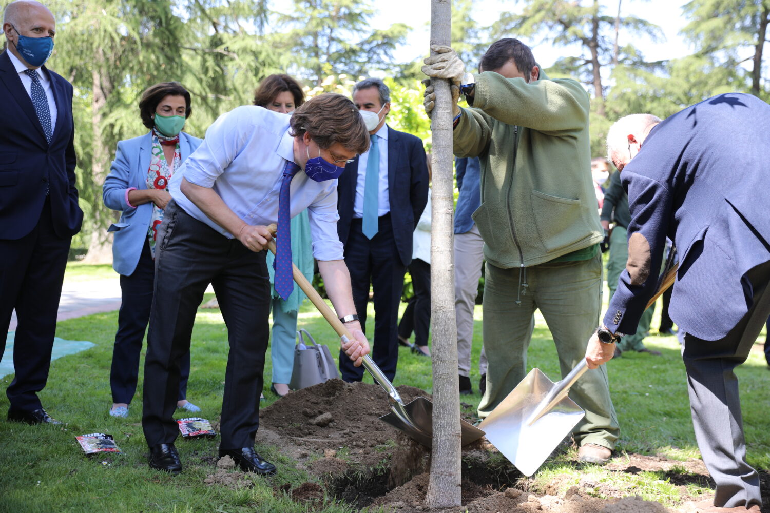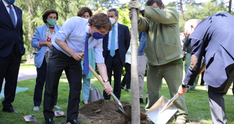 El alcalde de Madrid, José Luis Martínez-Almeida, acompañado por la vicealcaldesa, Begoña Villacís, y el delegado de Medio Ambiente y Movilidad, Borja Carabante, ha participado este miércoles en la plantación de los primeros árboles del proyecto Re-Planta Madrid que, a iniciativa de la asociación Madrid Futuro, promoverá a través de una plataforma empresarial y ciudadana la plantación de miles de árboles en la ciudad para recuperar el patrimonio arbóreo tras las consecuencias del temporal Filomena. En el acto, celebrado en los jardines de Cecilio Rodríguez del parque de El Retiro, una de las zonas más afectadas por la borrasca, también han participado el concejal del distrito de Retiro, Santiago Saura, y el presidente de Madrid Futuro, Manuel Bretón.