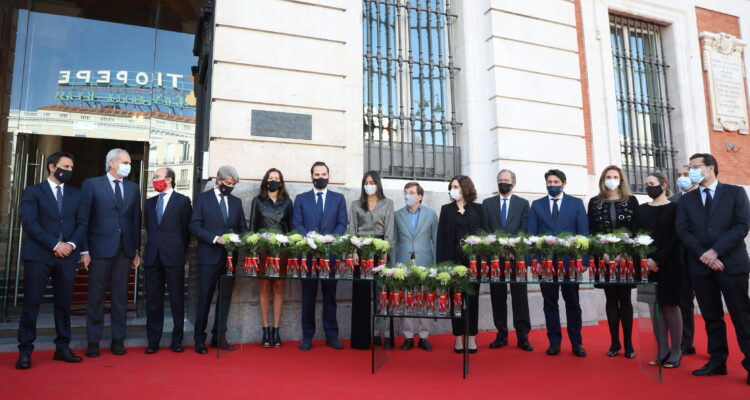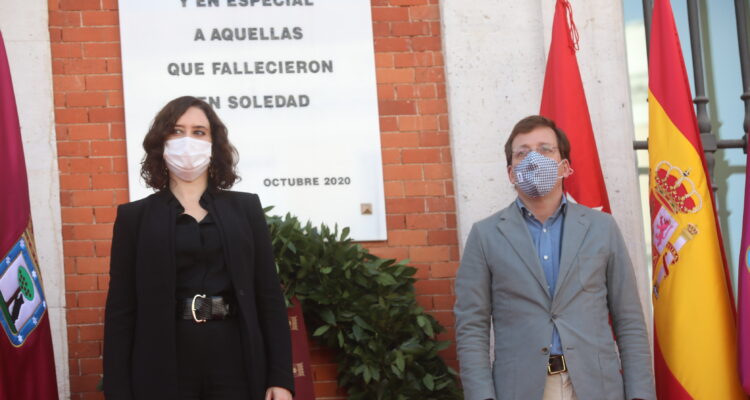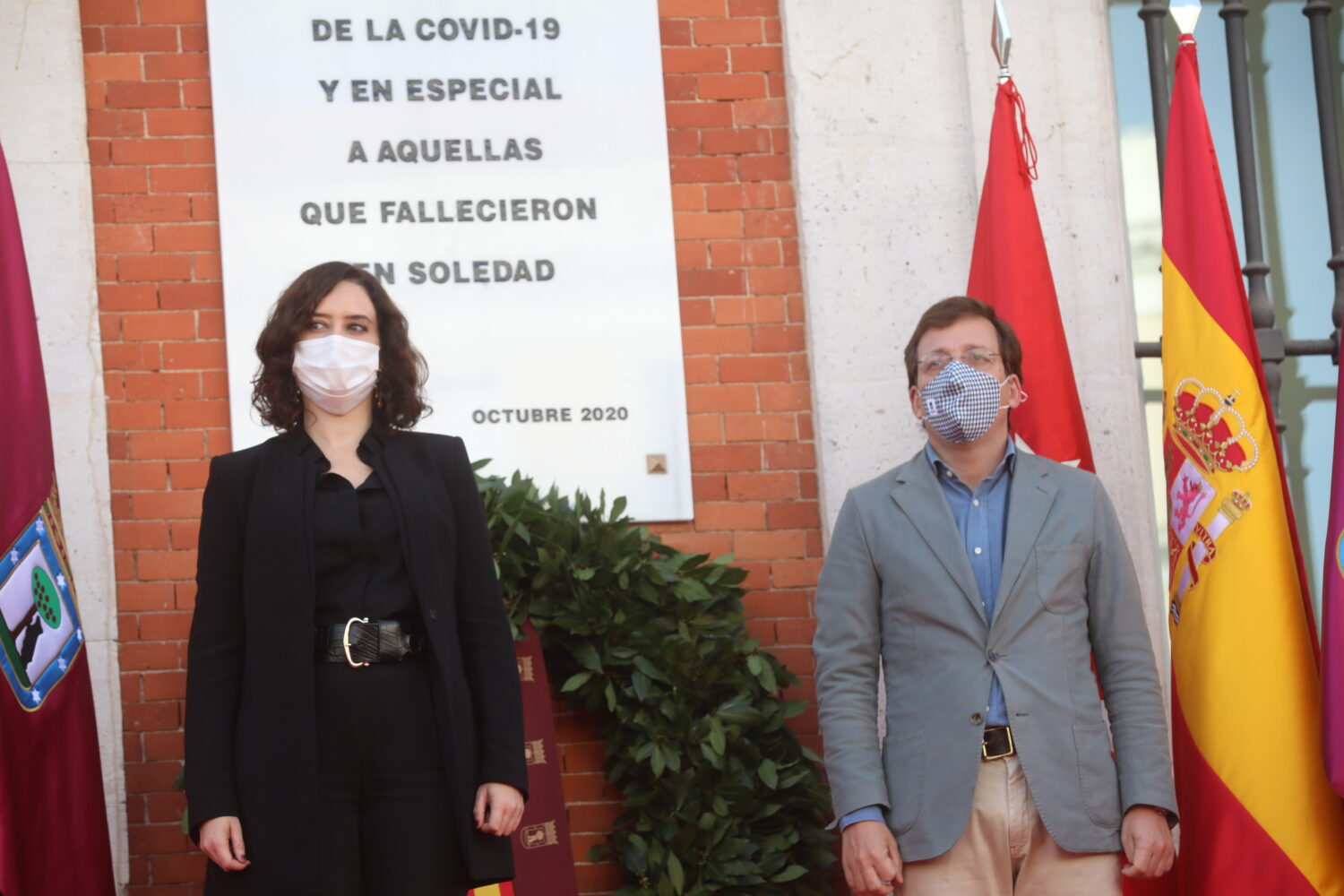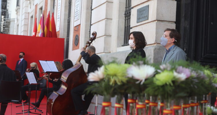 Durante la ceremonia, celebrada en la Real Casa de Correos, el alcalde y la presidenta de la Comunidad de Madrid, Isabel Díaz Ayuso, han depositado una corona de laurel en memoria a las personas fallecidas a consecuencia de la pandemia ante la placa colocada en la fachada principal del edificio, sede del Gobierno regional, en especial recuerdo de aquellas que murieron en soledad.