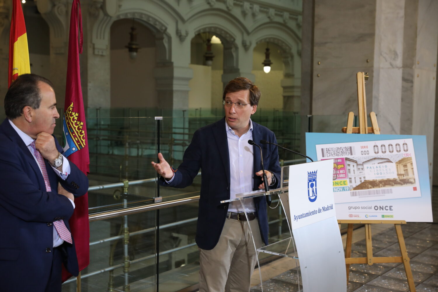 El alcalde de Madrid, José Luis Martínez-Almeida, ha presentado hoy el cupón especial que la Organización Nacional de Ciegos Españoles (ONCE) ha editado con motivo del Centenario del Palacio de Cibeles, del que se van a poner en circulación más de 5,5 millones de boletos para el sorteo del 12 de noviembre y que repartirán 19.000 vendedores, casi 2.000 de ellos en la Comunidad de Madrid y cerca de 1.000 en la ciudad.