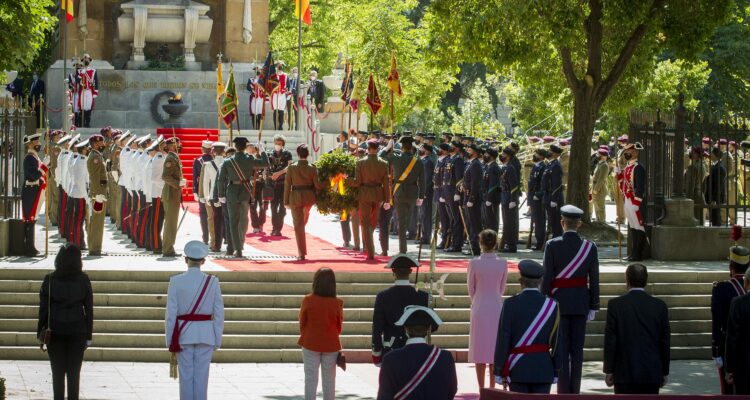 Durante el acto, el rey ha depositado una corona ante el obelisco de la plaza de la Lealtad que recuerda a los caídos por España y posteriormente se ha celebrado el desfile en el que han participado 500 militares, hombres y mujeres, de cinco compañías integradas en un batallón mixto formado por la Guardia Real, los ejércitos de Tierra y Aire, así como la Armada y la Guardia Civil. /