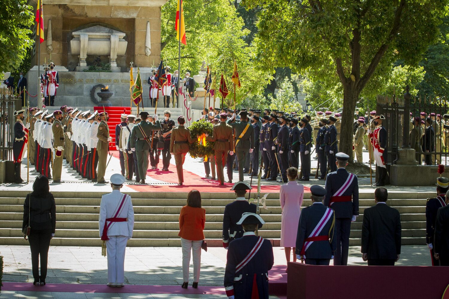 Durante el acto, el rey ha depositado una corona ante el obelisco de la plaza de la Lealtad que recuerda a los caídos por España y posteriormente se ha celebrado el desfile en el que han participado 500 militares, hombres y mujeres, de cinco compañías integradas en un batallón mixto formado por la Guardia Real, los ejércitos de Tierra y Aire, así como la Armada y la Guardia Civil. /