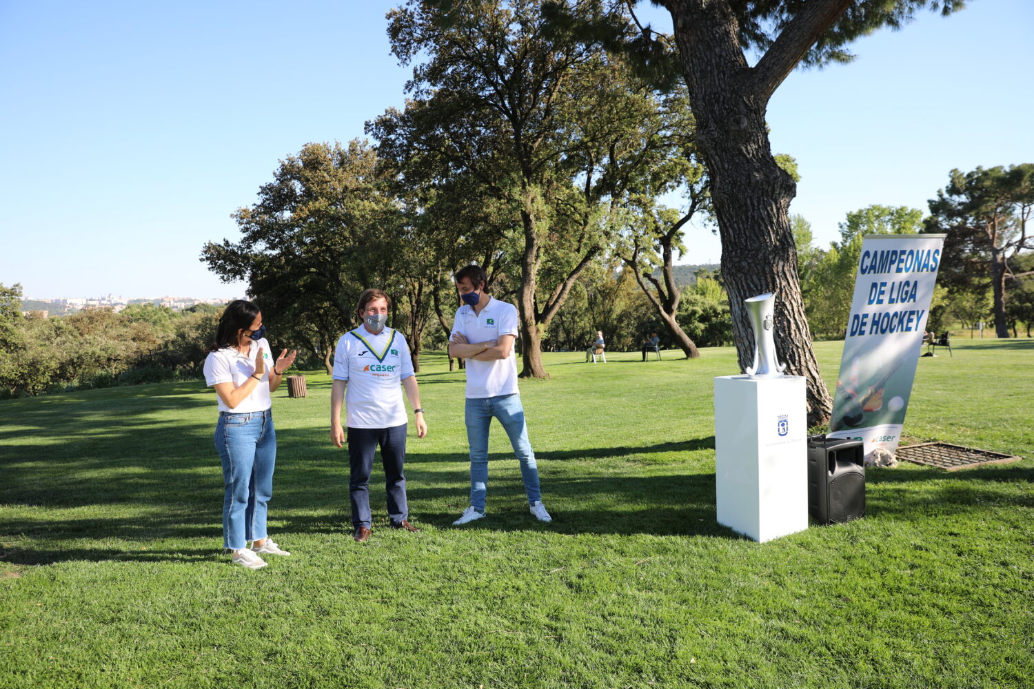 El alcalde de Madrid, José Luis Martínez-Almeida, ha visitado este miércoles el Club de Campo Villa de Madrid junto con la concejala delegada de Deporte, Sofía Miranda, y representantes de los grupos municipales para felicitar a los jugadores y al cuerpo técnico y celebrar con ellos el doblete conseguido por los equipos masculino y femenino de hockey sobre hierba que se han proclamado campeones de la Liga de División de Honor de la temporada 2020-2021 durante la Final Four disputada el pasado fin de semana en Tarrasa.