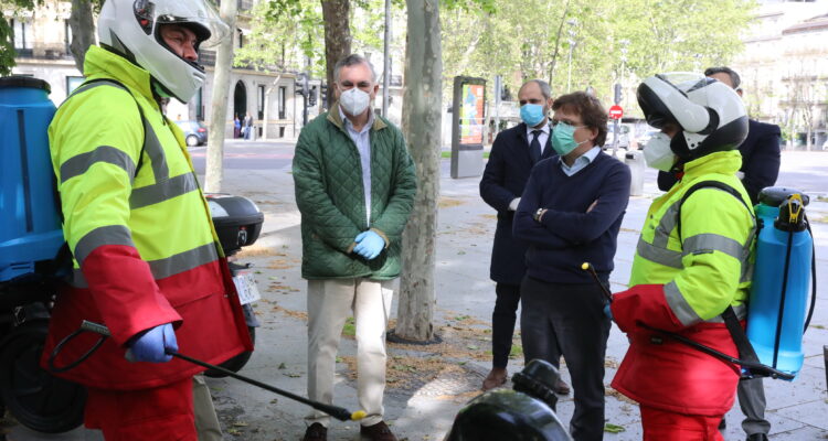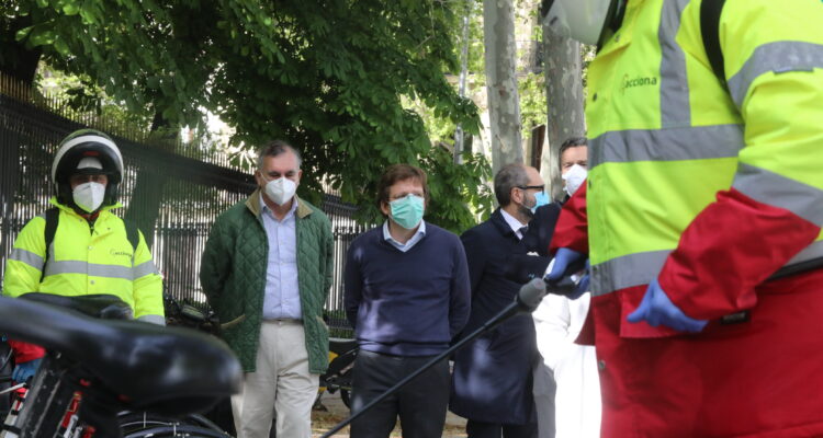 El alcalde de Madrid, José Luis Martínez-Almeida, acompañado del delegado del Área de Medio Ambiente y Movilidad, Borja Carabante, ha visitado la estación de BiciMAD de la Puerta de Alcalá para conocer de primera mano el proceso de desinfección de las estaciones y las bicicletas el día en el que el Ayuntamiento reabre este servicio.