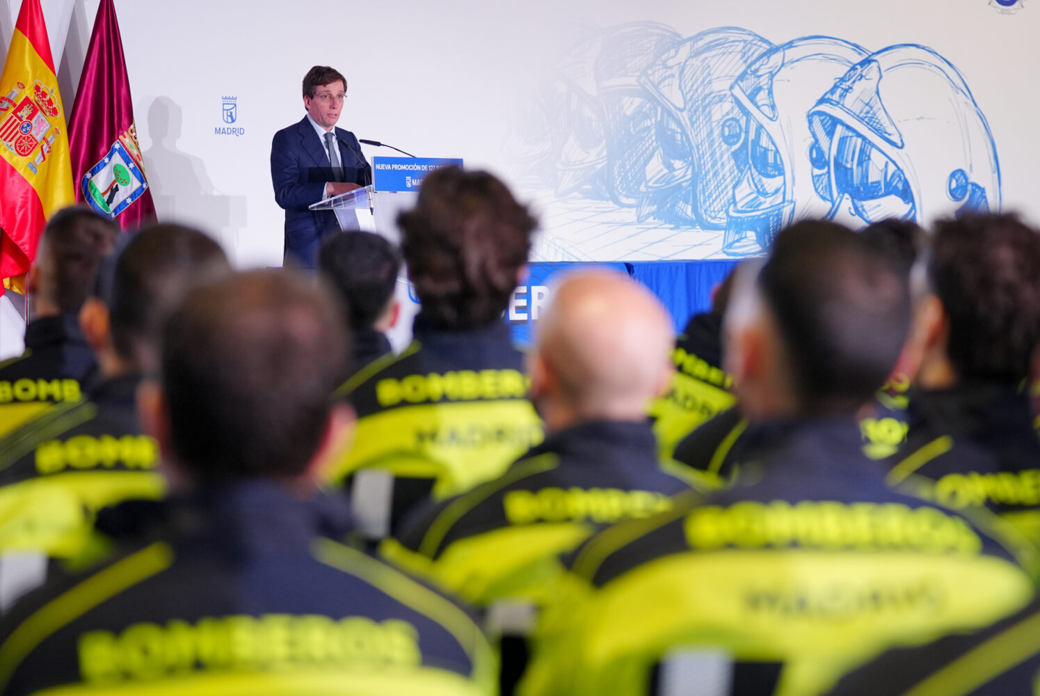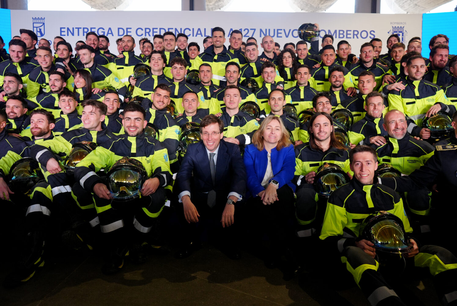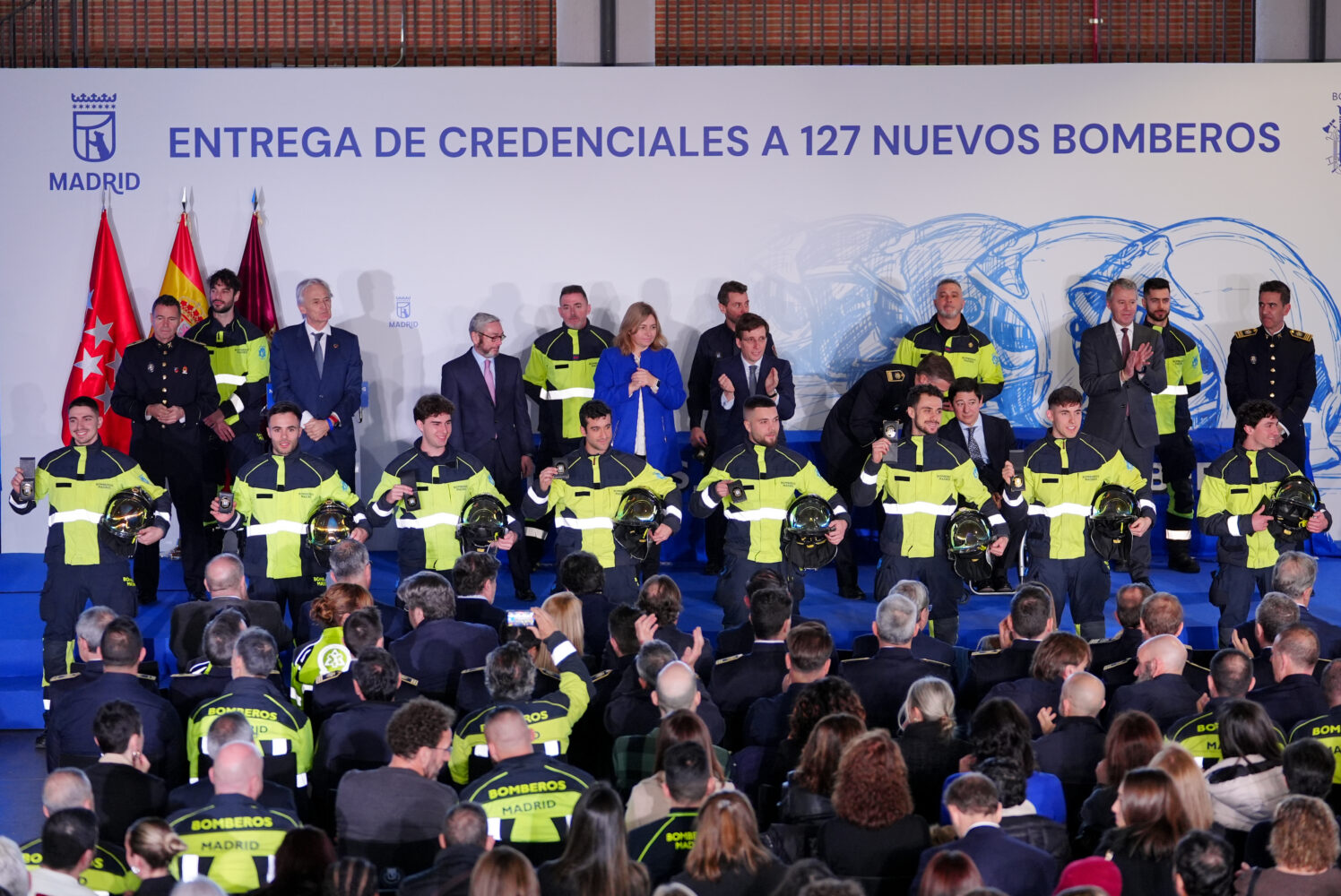 El alcalde de Madrid, José Luis Martínez-Almeida, junto a la vicealcaldesa y delegada de Seguridad y Emergencias, Inma Sanz, ha dado hoy la bienvenida en el Pabellón de Convenciones de la Casa de Campo a la promoción de 127 nuevos bomberos especialistas del Ayuntamiento de Madrid que, tras concluir su formación, se incorporarán próximamente a los 13 parques que prestan servicio en la ciudad.