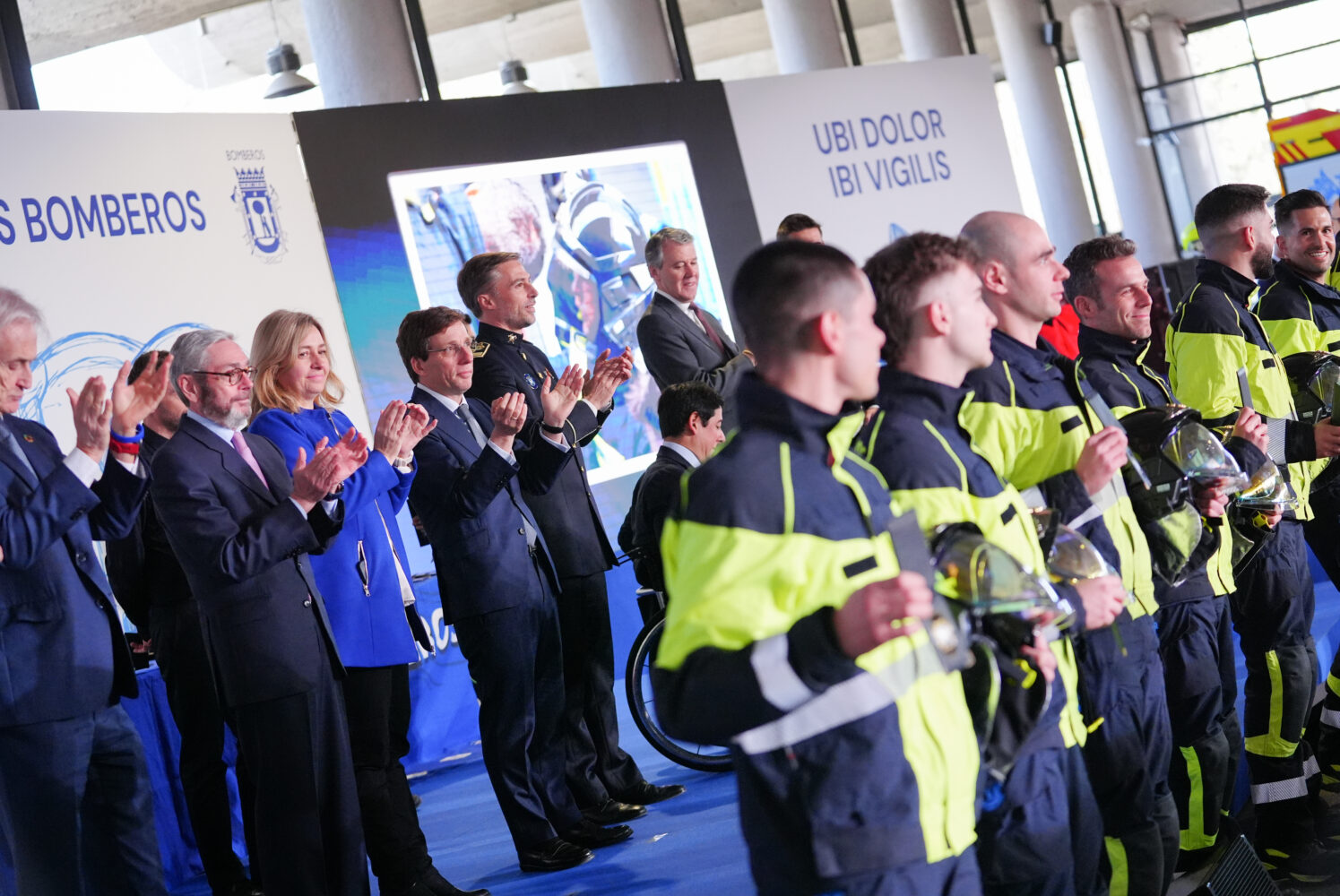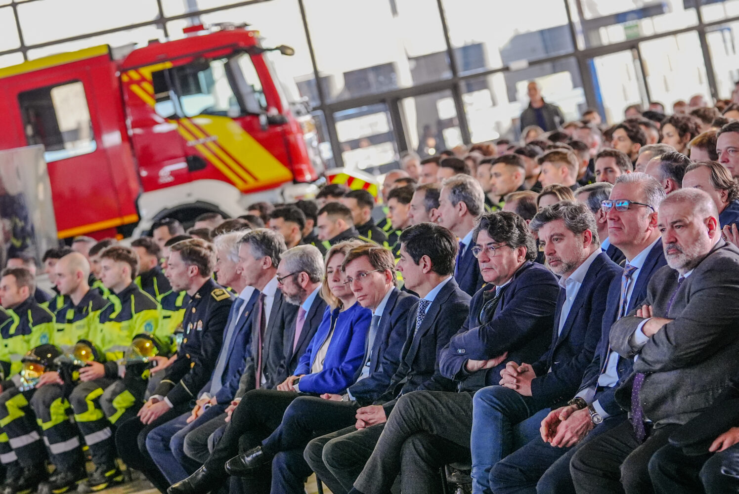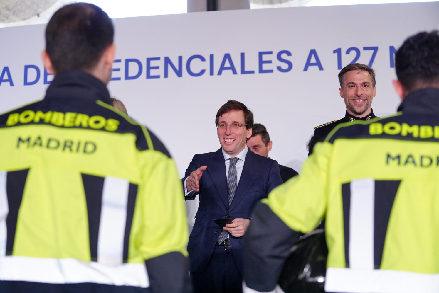 El alcalde de Madrid, José Luis Martínez-Almeida, junto a la vicealcaldesa y delegada de Seguridad y Emergencias, Inma Sanz, ha dado hoy la bienvenida en el Pabellón de Convenciones de la Casa de Campo a la promoción de 127 nuevos bomberos especialistas del Ayuntamiento de Madrid que, tras concluir su formación, se incorporarán próximamente a los 13 parques que prestan servicio en la ciudad.