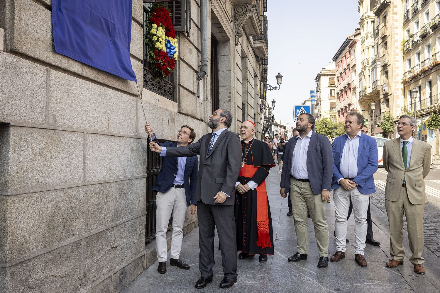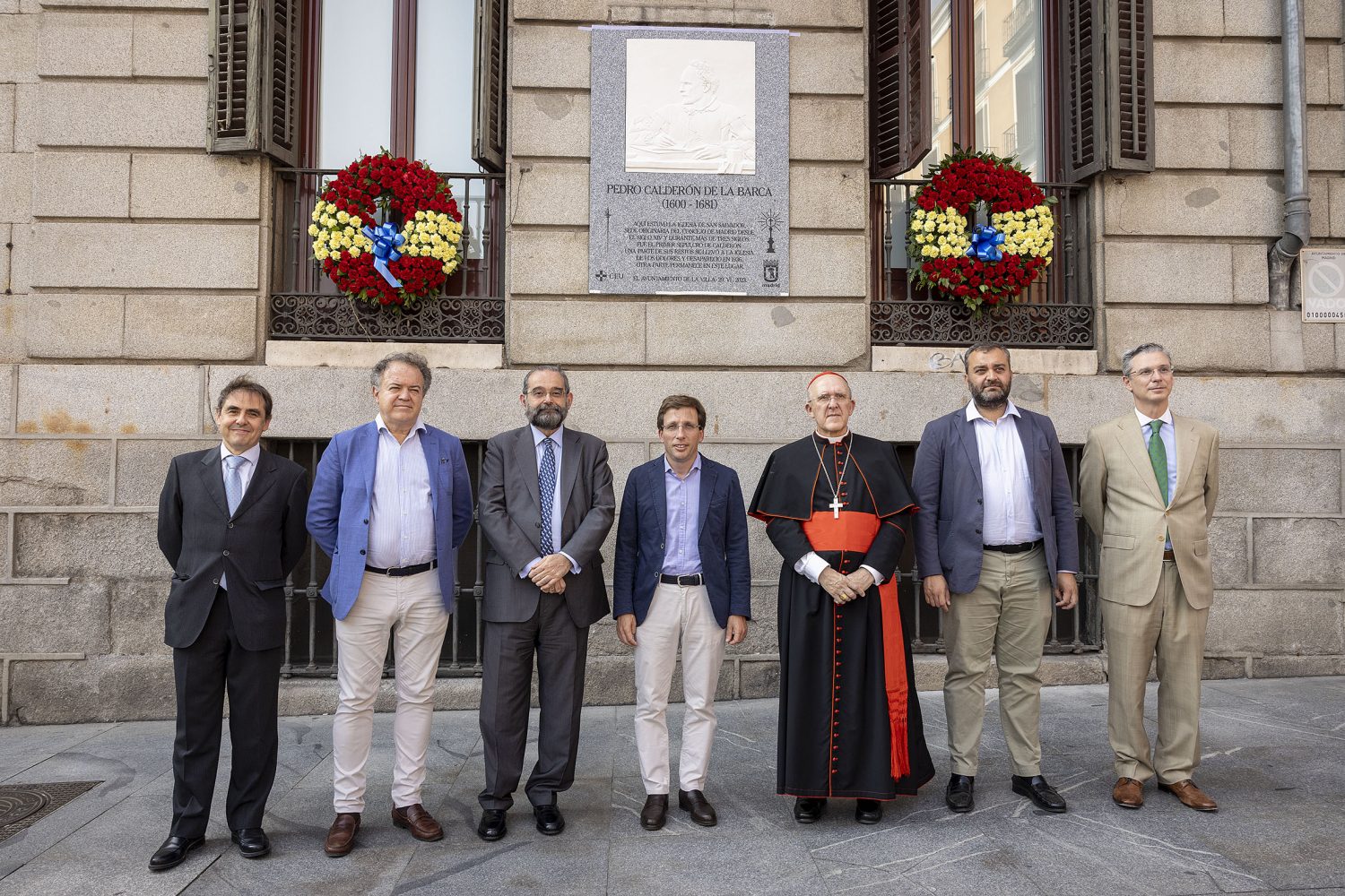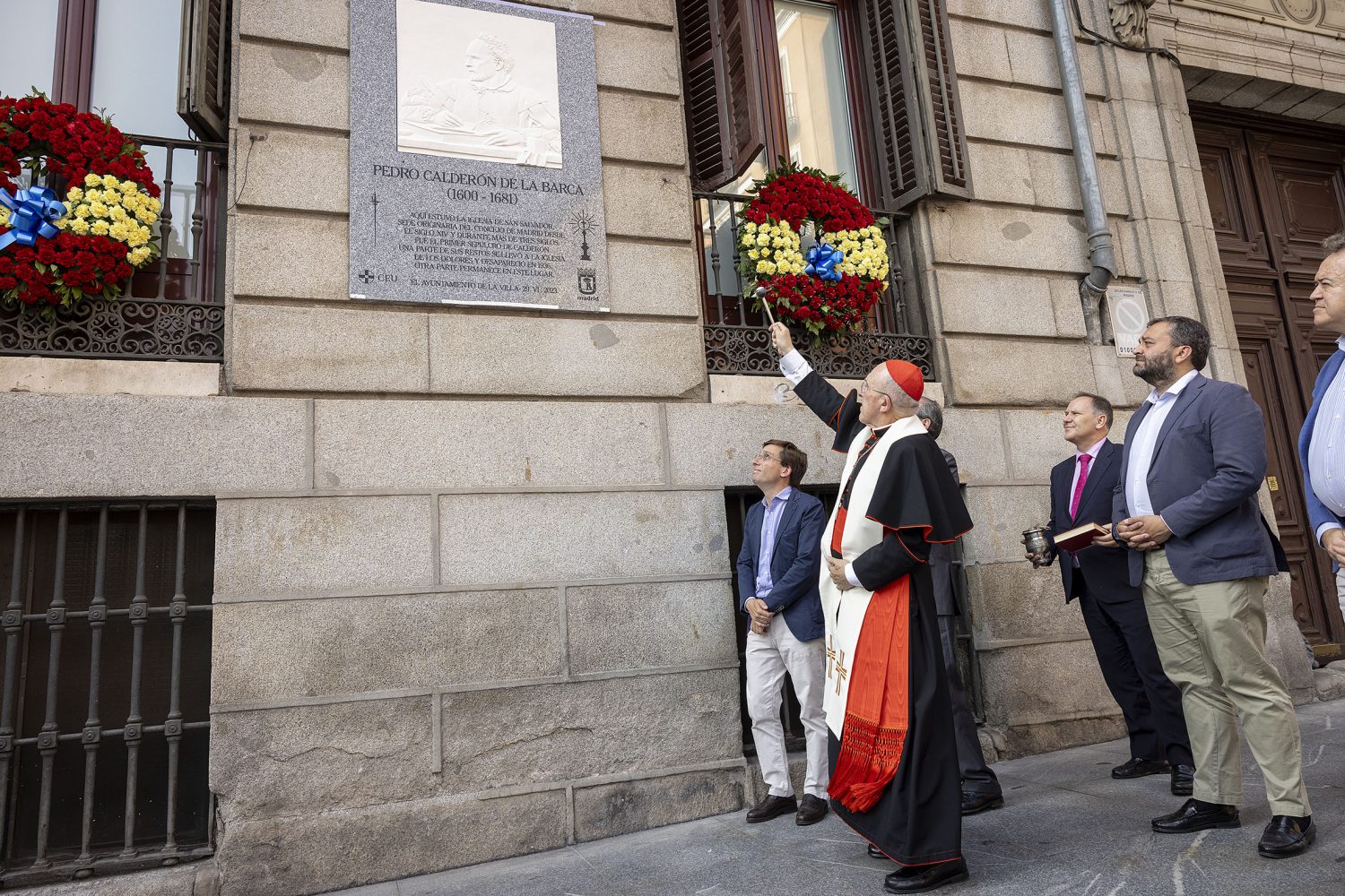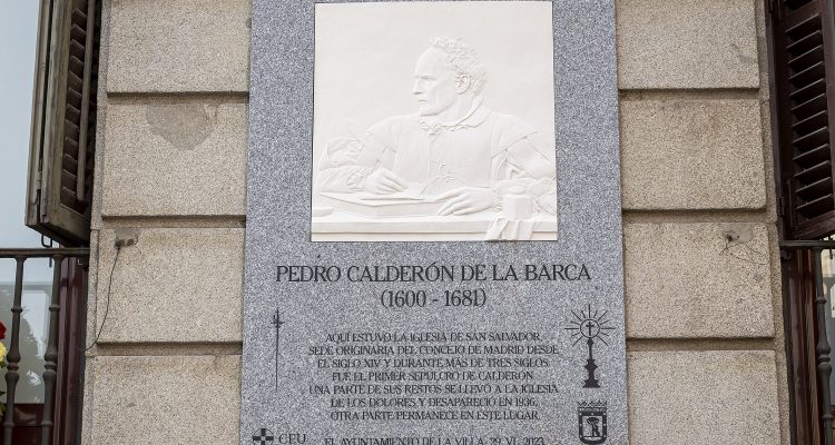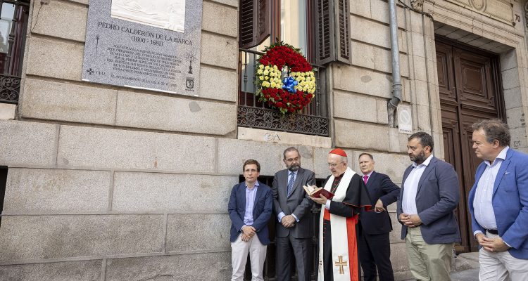El alcalde de Madrid, José Luis Martínez-Almeida, acompañado por el concejal del distrito de Centro, Carlos Segura, el presidente de la Fundación Universitaria San Pablo CEU, Alfonso Bullón de Mendoza, y el cardenal Carlos Osorio ha descubierto una placa conmemorativa a Pedro Calderón de la Barca, colocada en la calle Mayor, 70. Promovida, diseñada y donada por la fundación universitaria al Consistorio, sustituirá a otra anterior que indicaba la localización de la desaparecida parroquia de San Salvador, en cuya cripta se situaba el primer sepulcro del escritor. La nueva placa incorpora un bajorrelieve del artista Juan Antonio Presas con la representación de un Calderón joven.