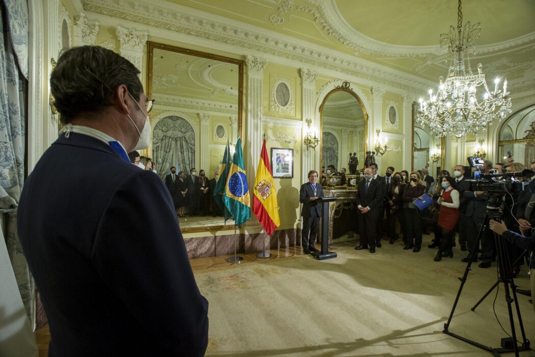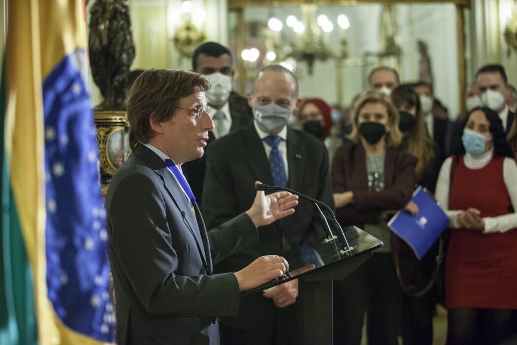 El alcalde de Madrid, José Luis Martínez-Almeida, ha recibido esta tarde la insignia de la Orden de Río Branco de manos del embajador de Brasil en España, Pompeu Andreucci Neto, en un acto celebrado en la Embajada de Brasil en Madrid en el que ha manifestado su compromiso de seguir intensificando las relaciones entre ambos países ya que “Madrid es la capital de Iberoamérica en Europa y conformamos una comunidad de afectos, historia, cultura, lazos económicos y sociales con un gran futuro por delante”.