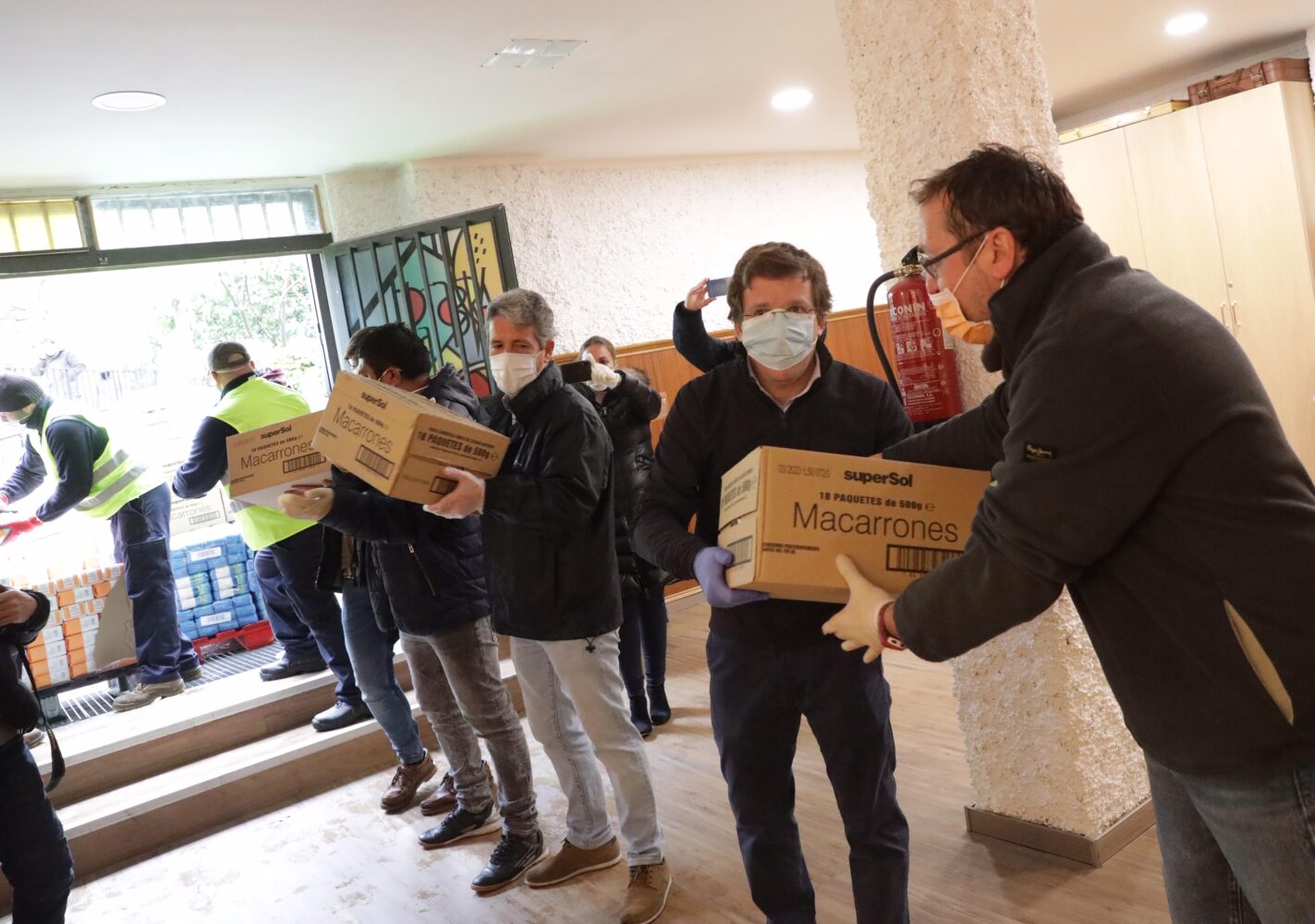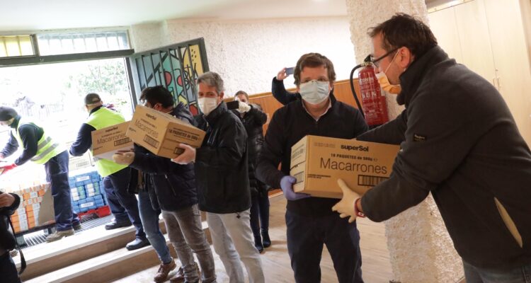 El alcalde de Madrid, José Luis Martínez-Almeida, acompañado por el concejal del distrito de Latina, Alberto Serrano, ha visitado este miércoles la parroquia Jesús y María de Aluche, a la que está mañana han llegado cinco toneladas de alimentos donados por empresas madrileñas para ser repartidos entre las personas más necesitadas.