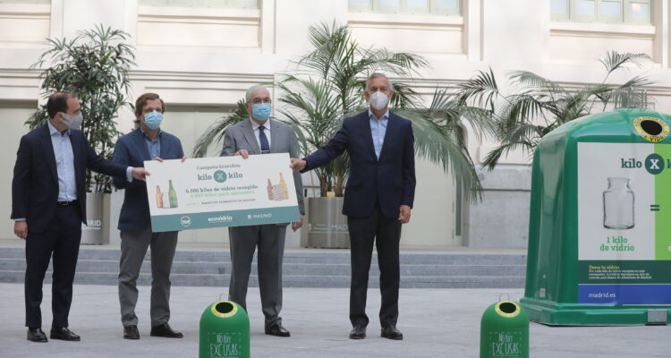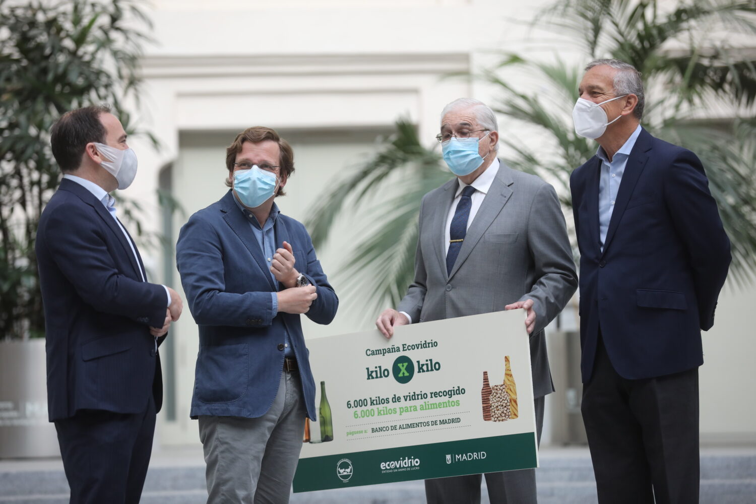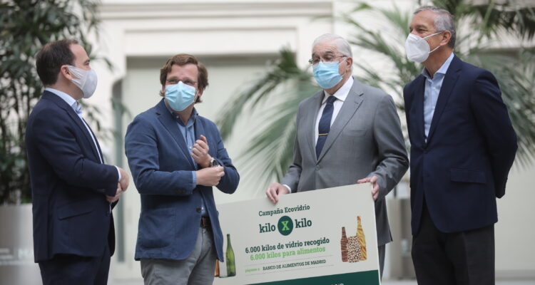 El alcalde de Madrid, José Luis Martínez-Almeida, acompañado del delegado de Medio Ambiente y Movilidad, Borja Carabante, ha hecho entrega esta mañana de un cheque por valor de 6.000 euros al Banco de Alimentos de Madrid. Esta iniciativa es fruto de la campaña solidaria ‘1 kilo de vidrio x 1 kilo de alimentos’ que el Ayuntamiento puso en marcha con Ecovidrio y que ha estado presente en los 21 distritos de la ciudad.