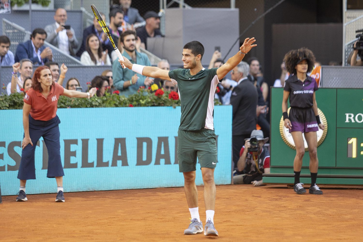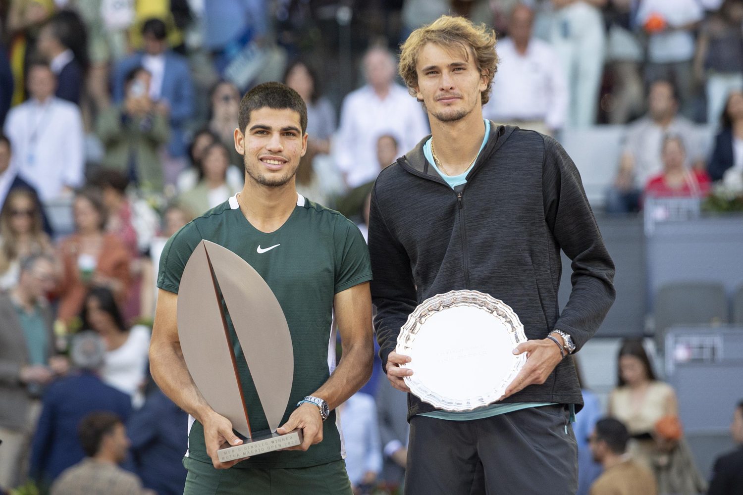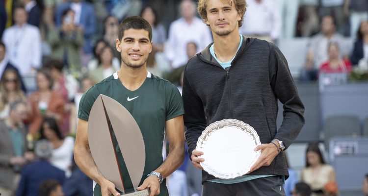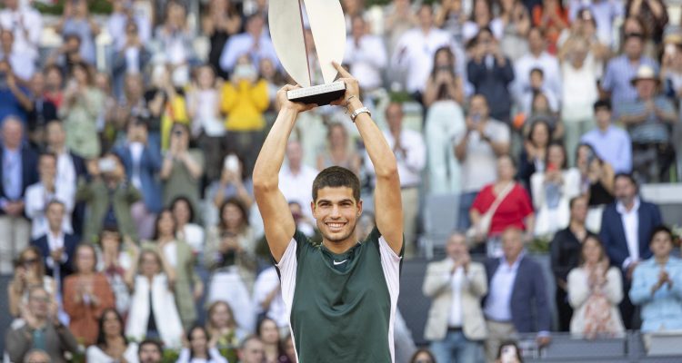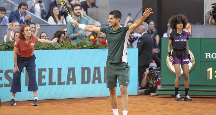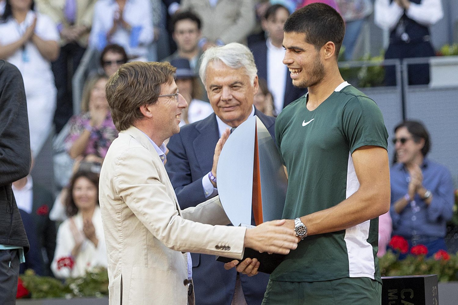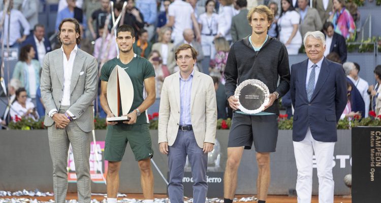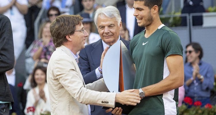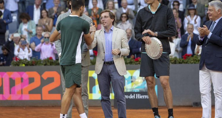 El alcalde de Madrid, José Luis Martínez-Almeida, ha hecho entrega a Carlos Alcaraz del trofeo de campeón del Mutua Madrid Open 2022 junto al director del torneo, Feliciano López, y el presidente de Mutua Madrileña, Ignacio Garralda. Alcaraz ha vencido a Alexander Zverev por 6-3 y 6-1 y se ha convertido, con 19 años, en el ganador más joven de este torneo.