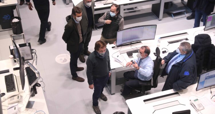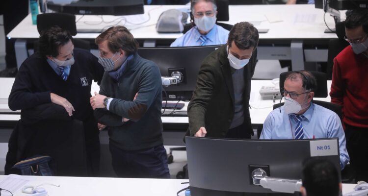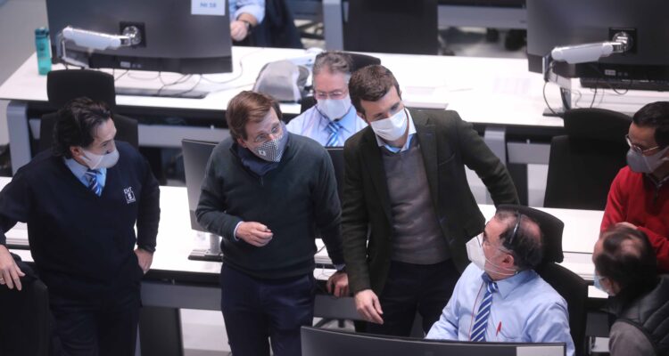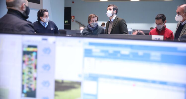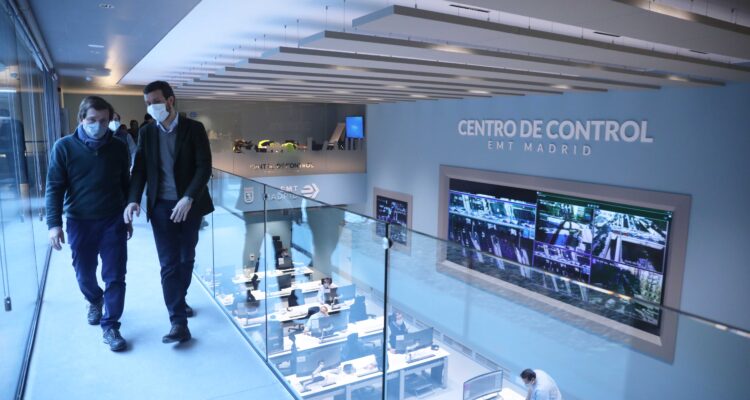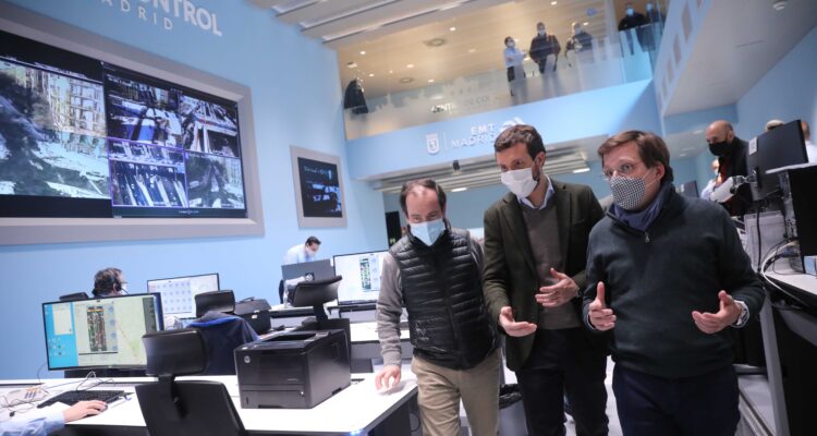 El alcalde de Madrid, José Luis Martínez-Almeida, acompañado del delegado del Área de Medio Ambiente y Movilidad, Borja Carabante, y del líder de la oposición, Pablo Casado, ha visitado hoy el Centro de Control de la Empresa Municipal de Transportes, donde ha agradecido la labor de los trabajadores de la EMT que, en una situación tan complicada como la vivida en Madrid, han seguido cumpliendo con su trabajo.