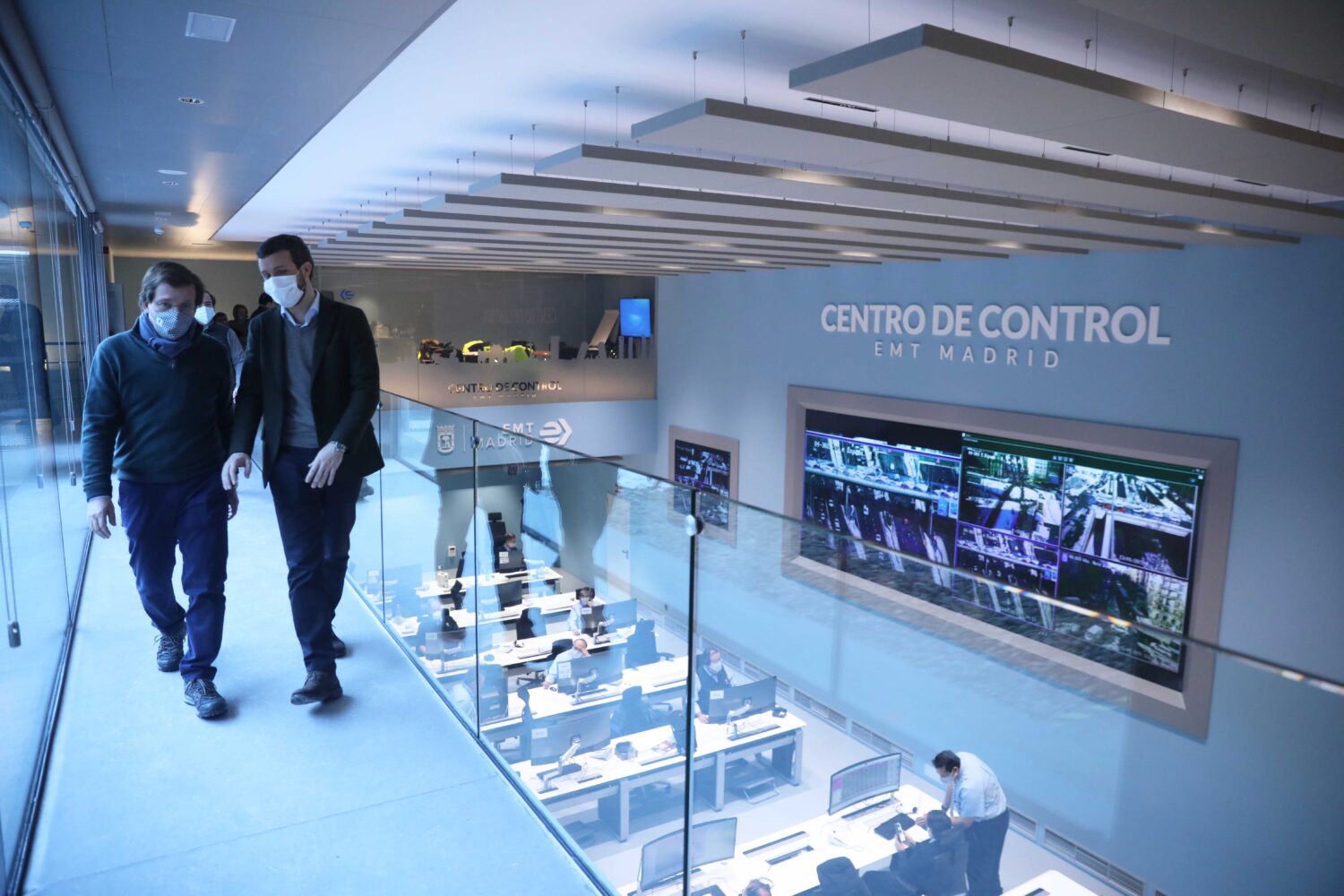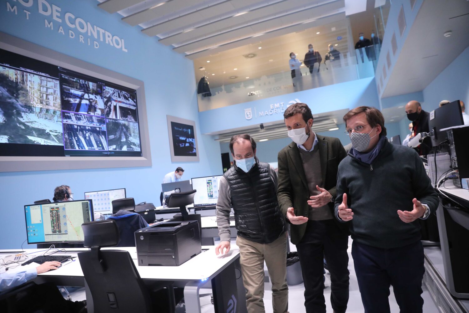 El alcalde de Madrid, José Luis Martínez-Almeida, acompañado del delegado del Área de Medio Ambiente y Movilidad, Borja Carabante, y del líder de la oposición, Pablo Casado, ha visitado hoy el Centro de Control de la Empresa Municipal de Transportes, donde ha agradecido la labor de los trabajadores de la EMT que, en una situación tan complicada como la vivida en Madrid, han seguido cumpliendo con su trabajo.