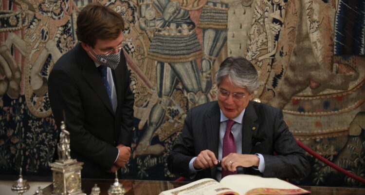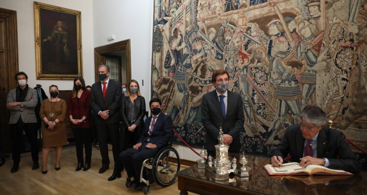 Tras el encuentro, el presidente de Ecuador ha saludado a los portavoces de los grupos municipales y en el Salón de Tapices ha firmado en el Libro de Oro del Ayuntamiento de Madrid. /