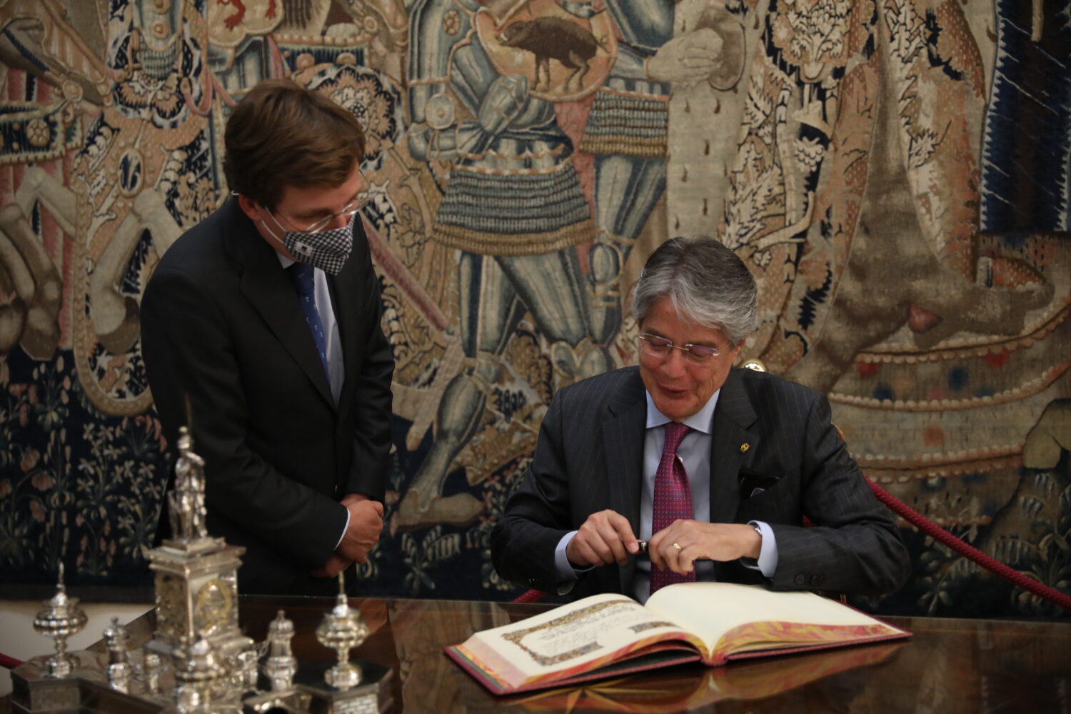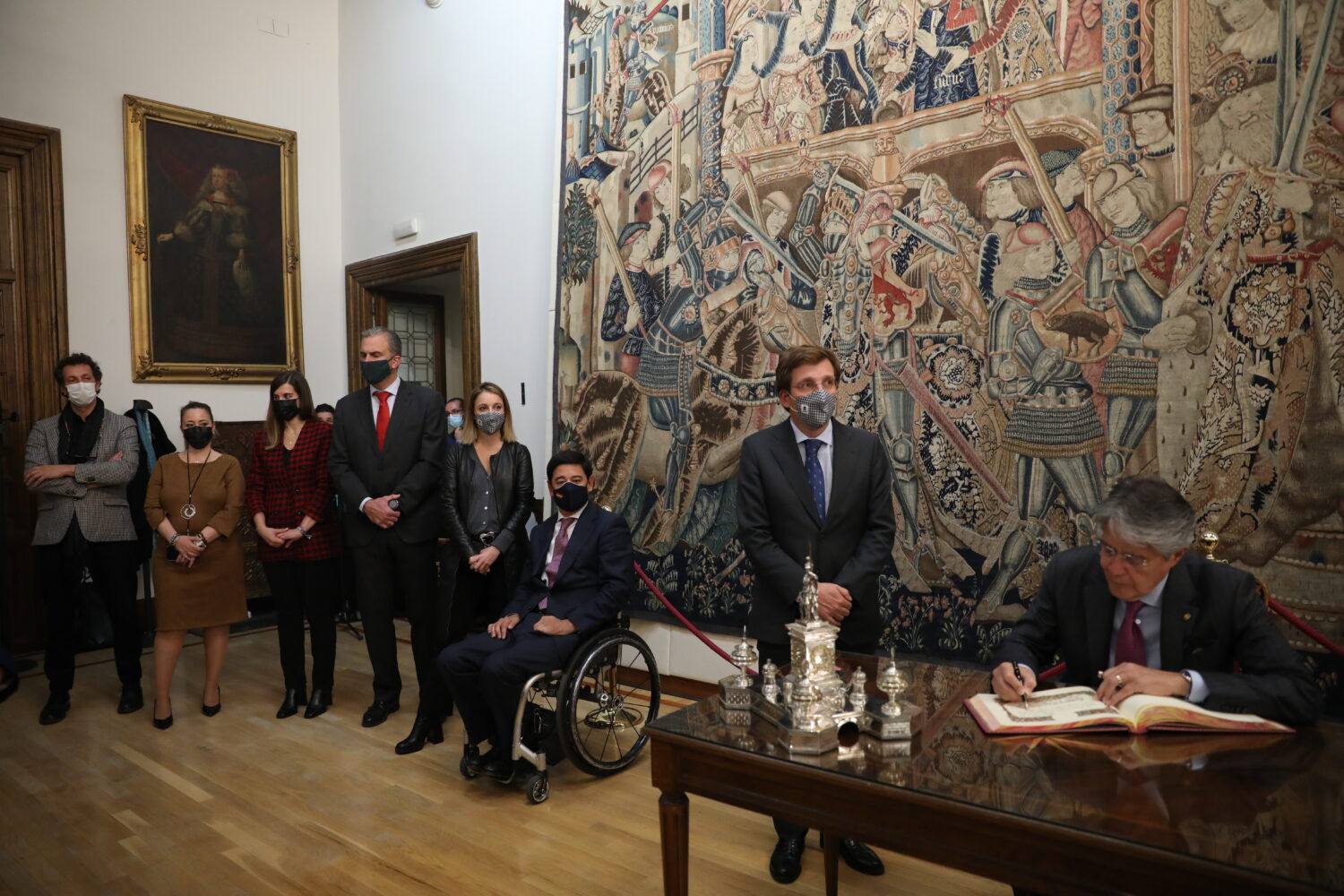 Tras el encuentro, el presidente de Ecuador ha saludado a los portavoces de los grupos municipales y en el Salón de Tapices ha firmado en el Libro de Oro del Ayuntamiento de Madrid. /