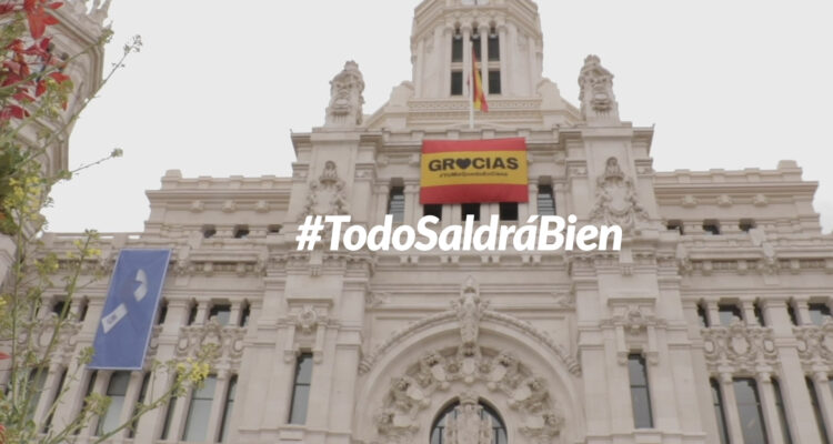 Con la campaña #YoMeQuedoEnCasa, el Ayuntamiento está difundiendo varios vídeos en los que los trabajadores municipales y de servicios y sectores esenciales agradecen a la población que se quede en sus domicilios. Además, dentro de esta misma campaña, el Consistorio ha colgado de la fachada de su sede, en el Palacio de Cibeles, una bandera española con la leyenda ‘Gracias #YoMeQuedoEnCasa’ y un lazo azul y blanco que simboliza el agradecimiento a todos los profesionales que continúan trabajando para que los servicios básicos de la ciudad sigan funcionando. Ambos mensajes suponen, además, un mensaje de esperanza que recuerda que, todos juntos y haciendo caso a las recomendaciones sanitarias, vamos a salir de esta situación./