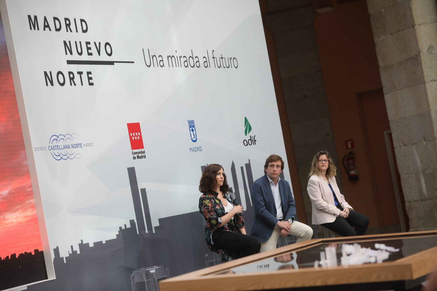 El alcalde de Madrid, José Luis Martínez-Almeida, acompañado de la vicealcaldesa, Begoña Villacís, la presidenta de la Comunidad de Madrid, Isabel Díaz Ayuso, y el presidente del Distrito Castellana Norte, Álvaro Aresti ha participado esta mañana en el acto de presentación de la maqueta del proyecto final de Madrid Nuevo Norte (MNN), que ha tenido lugar en el patio principal de la Real Casa de Correos.