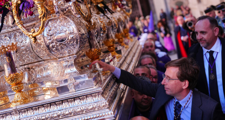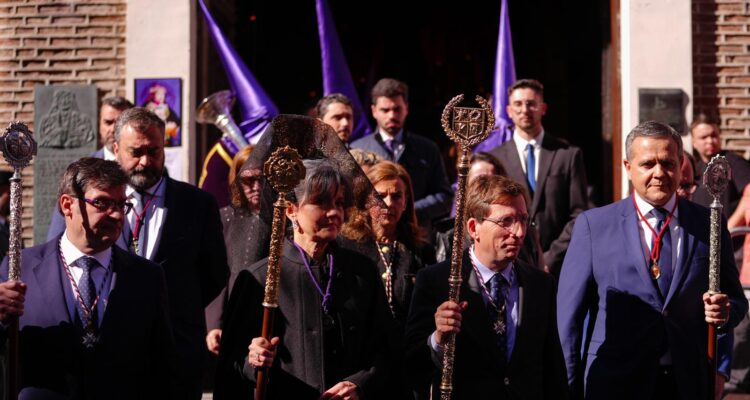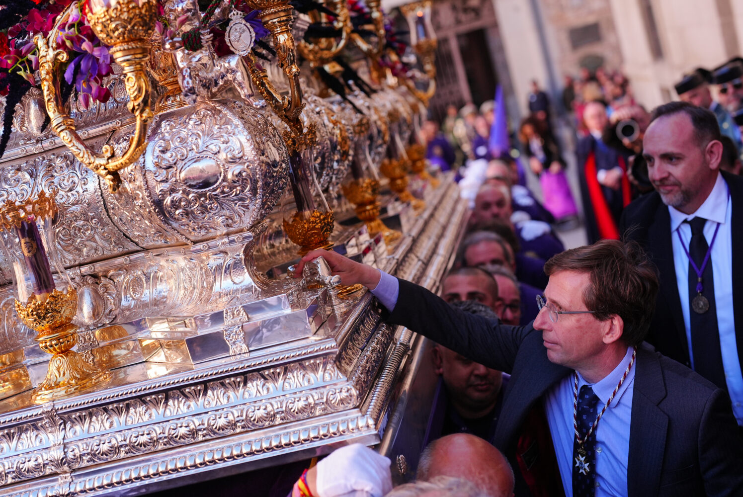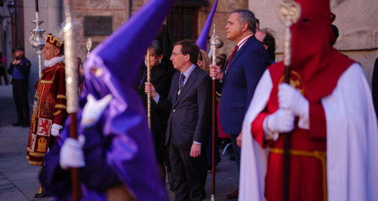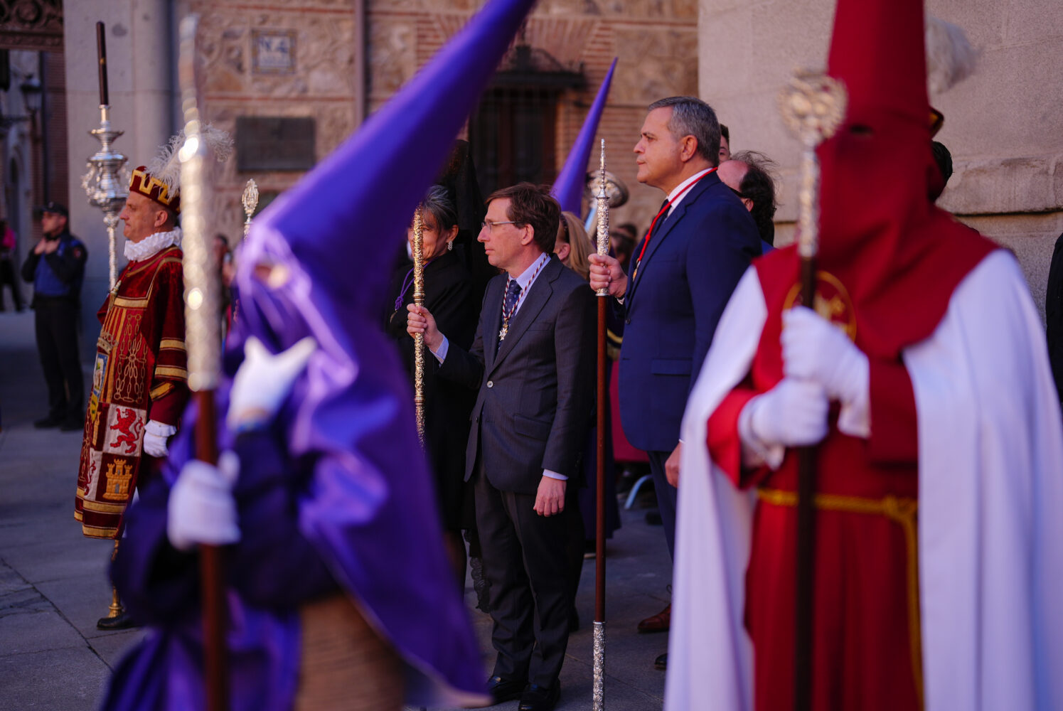 El alcalde de Madrid, José Luis Martínez-Almeida, acompañado del delegado de Políticas de Vivienda, Álvaro González; la concejala delegada de Turismo, Almudena Maíllo, y el concejal de Centro, Carlos Segura, ha participado este Jueves Santo en la procesión de Nuestro Padre Jesús Nazareno ‘El Pobre’ y María Santísima del Dulce Nombre en su Soledad, en una jornada en la que distintas cofradías transitan por las calles del centro de la ciudad.