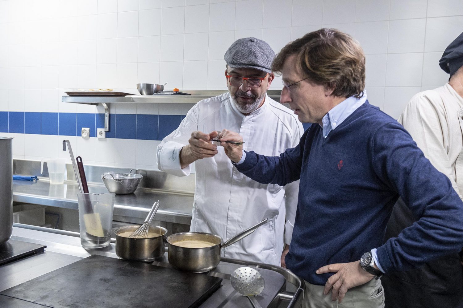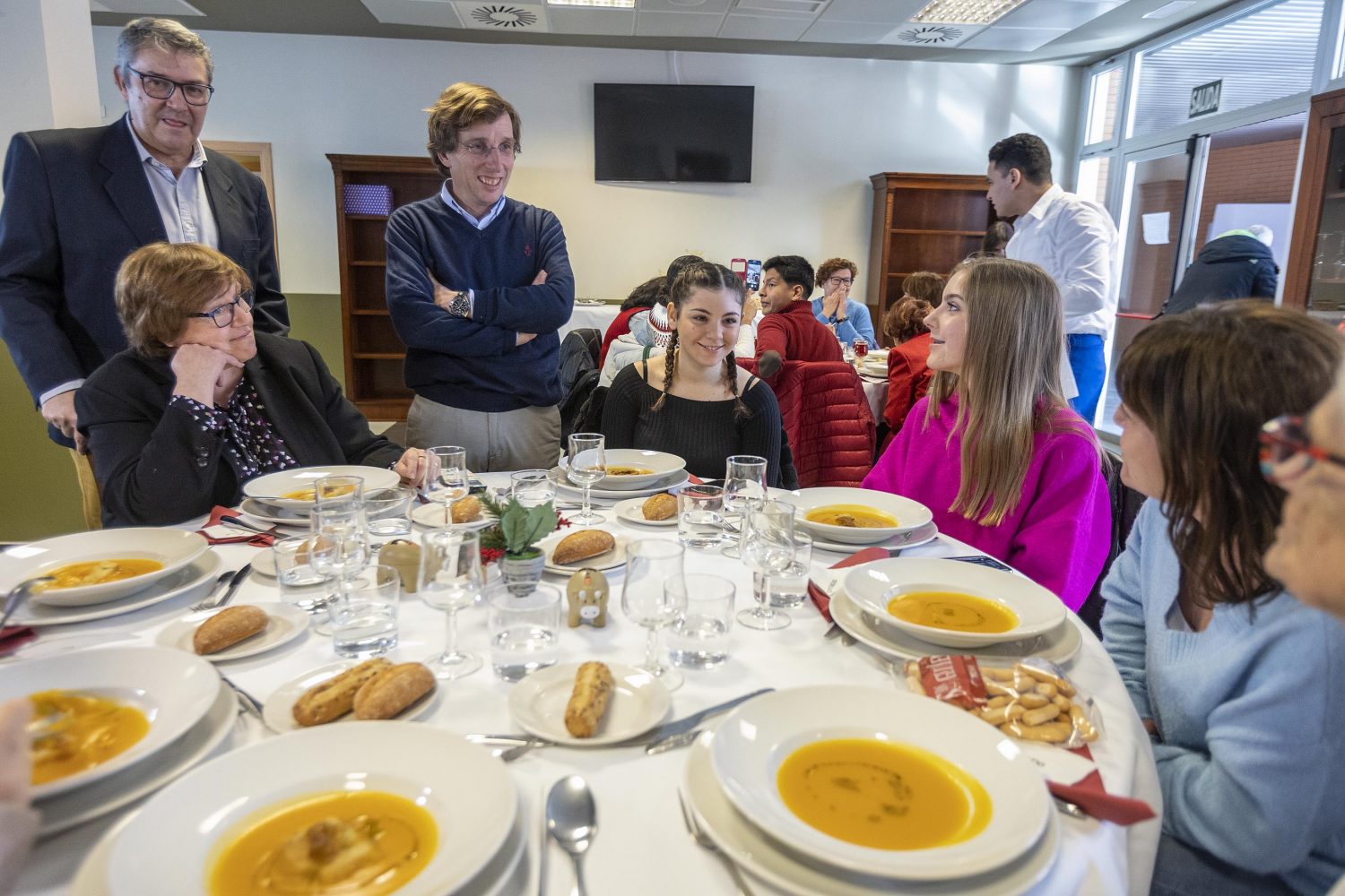 El alcalde de Madrid, José Luis Martínez-Almeida, ha visitado la Fundación José María de Llanos, donde los profesores y alumnos de la Escuela de Hostelería del Sur, proyecto de Formación Profesional que cuenta con la colaboración del Ayuntamiento y que se encuentra en el mismo edificio, conducidos por los chefs Jesús Sánchez e Iván Cerdeño, han sido los encargados de elaborar esta comida para las mujeres que, junto a sus hijos (100 comensales), residen en el centro de acogida gestionado por esta fundación.