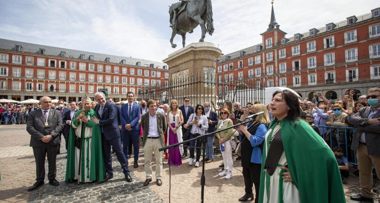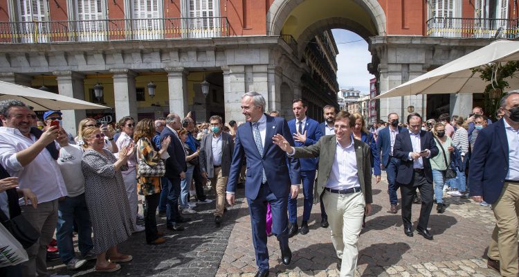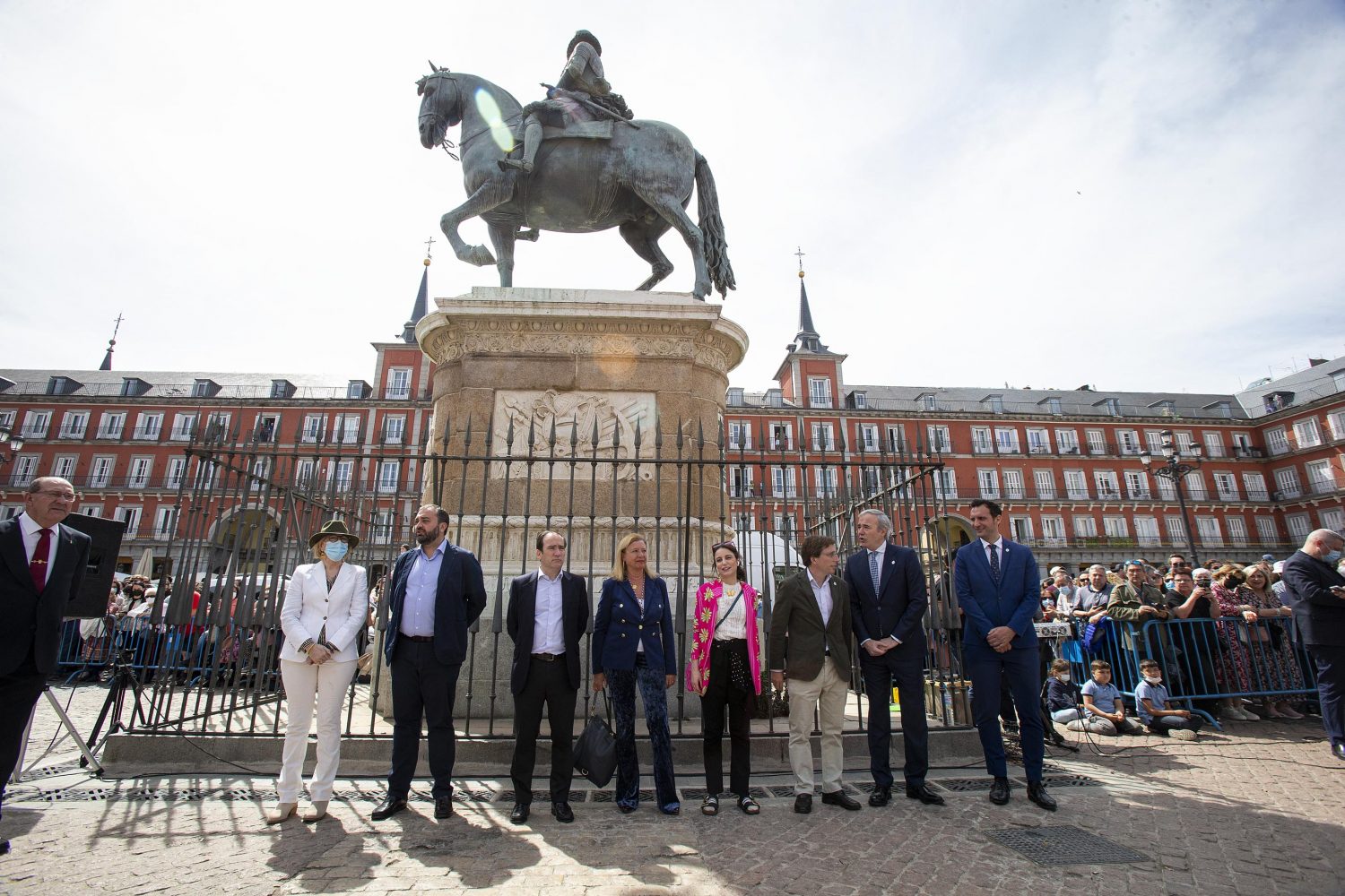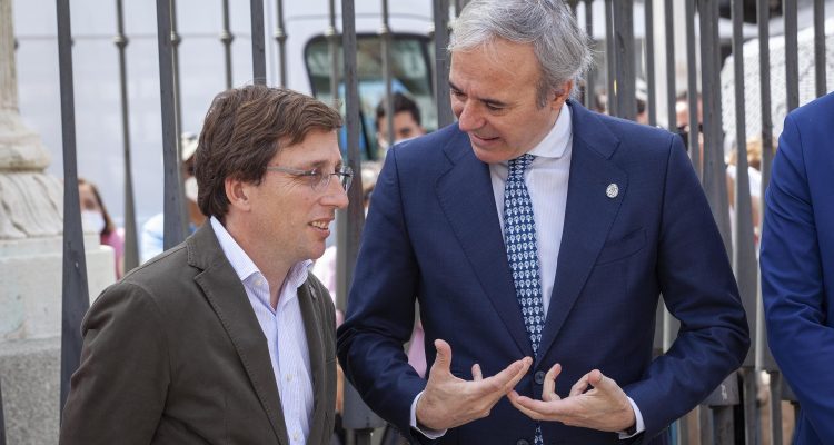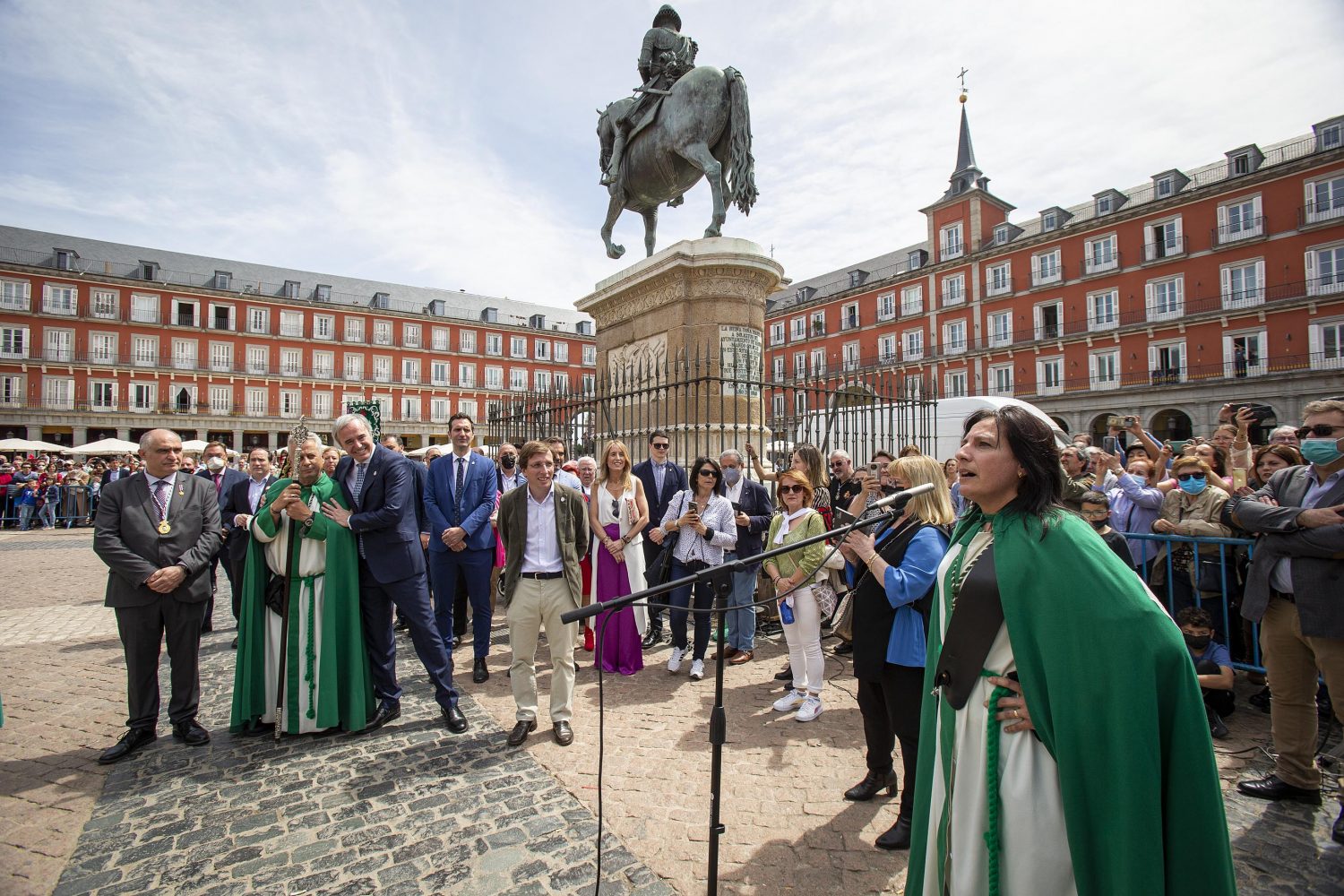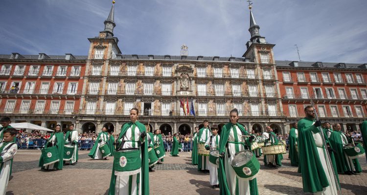 El alcalde de Madrid, José Luis Martínez-Almeida, y el de Zaragoza, Jorge Azcón, han presenciado en la plaza Mayor, junto a los delegados de Cultura, Turismo y Deporte, Andrea Levy; de Medio Ambiente y Movilidad, Borja Carabante, y de Obras y Equipamientos, Paloma García Romero, la tamborrada, uno de los actos más tradicionales, que supone el “broche de oro de la Semana Santa madrileña”, según ha señalado Almeida.