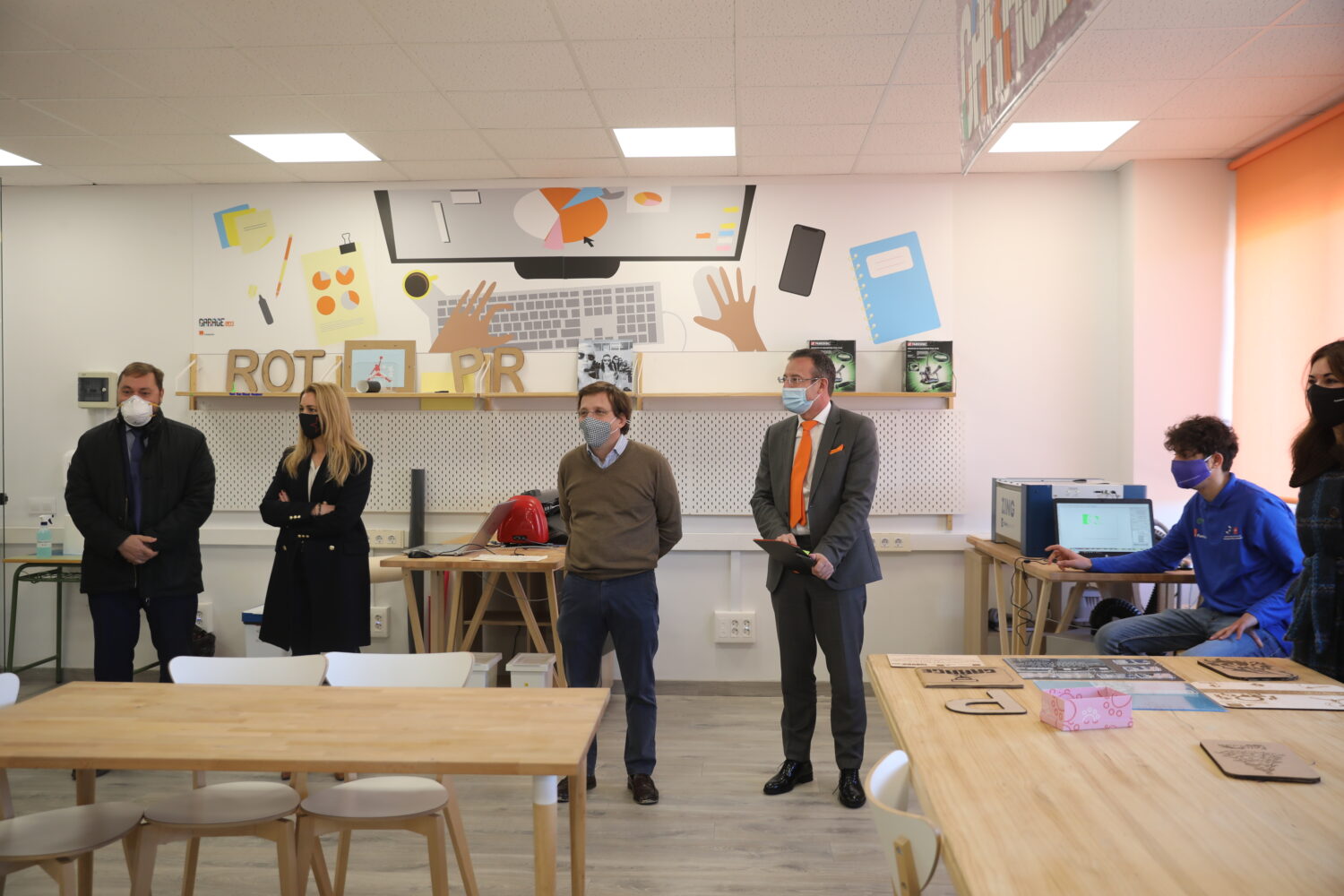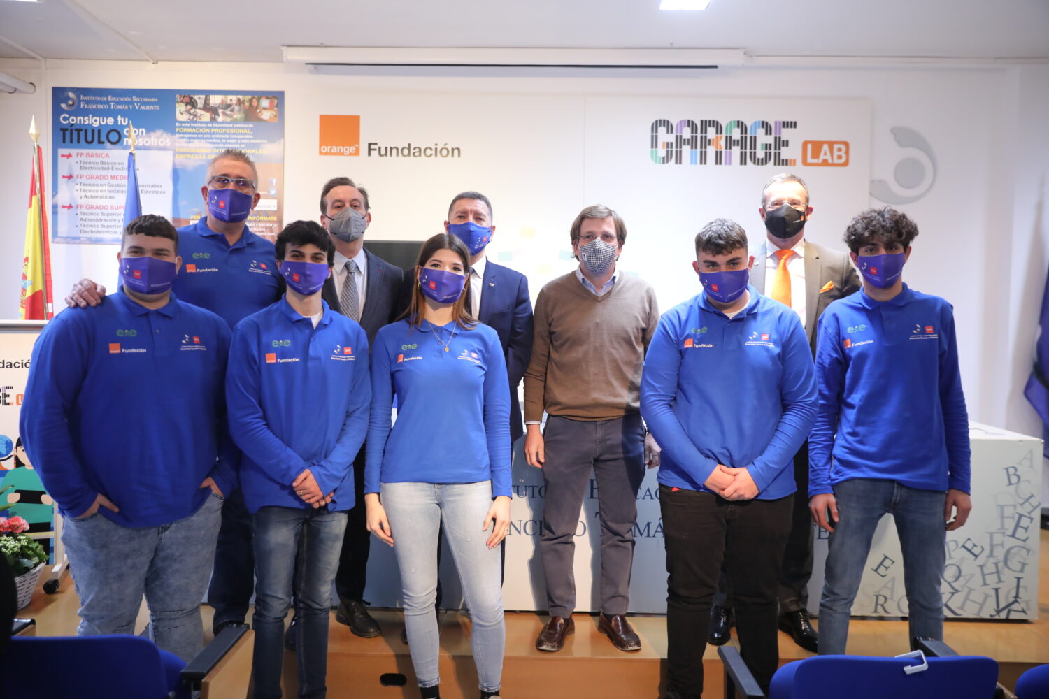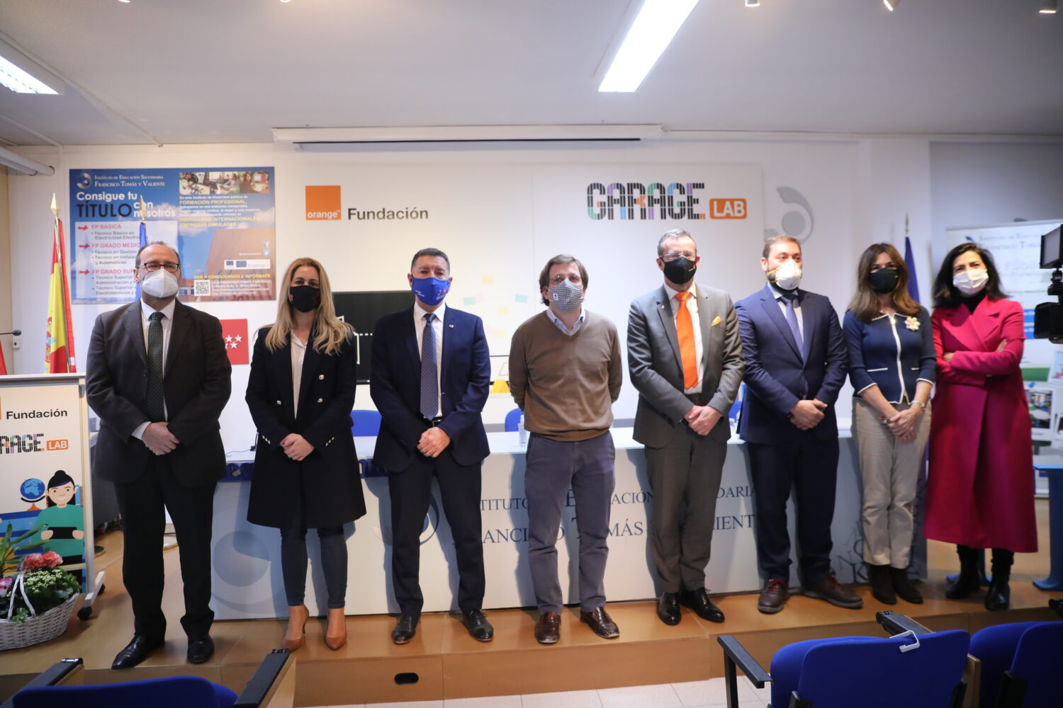 El alcalde de Madrid, José Luis Martínez-Almeida, ha asistido hoy, en el Instituto de Educación Secundaria Francisco Tomás y Valiente, a la presentación de un nuevo GarageLab, el programa formativo de la Fundación Orange que acerca espacios digitales a las escuelas de Segunda Oportunidad y de Formación Profesional.