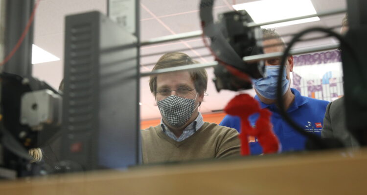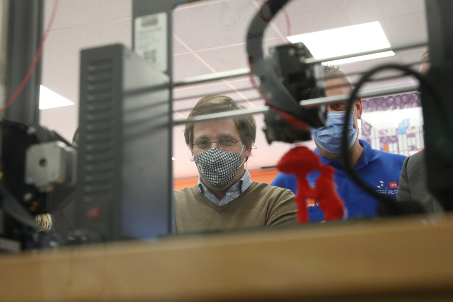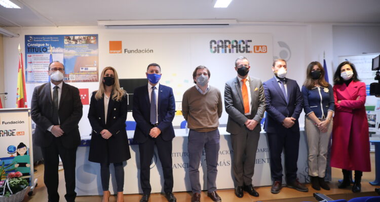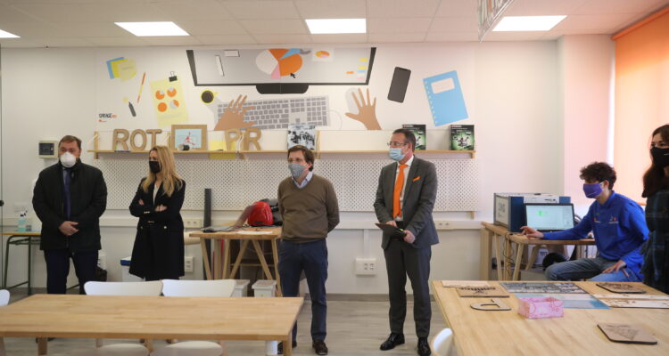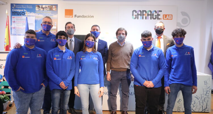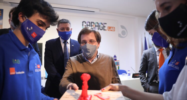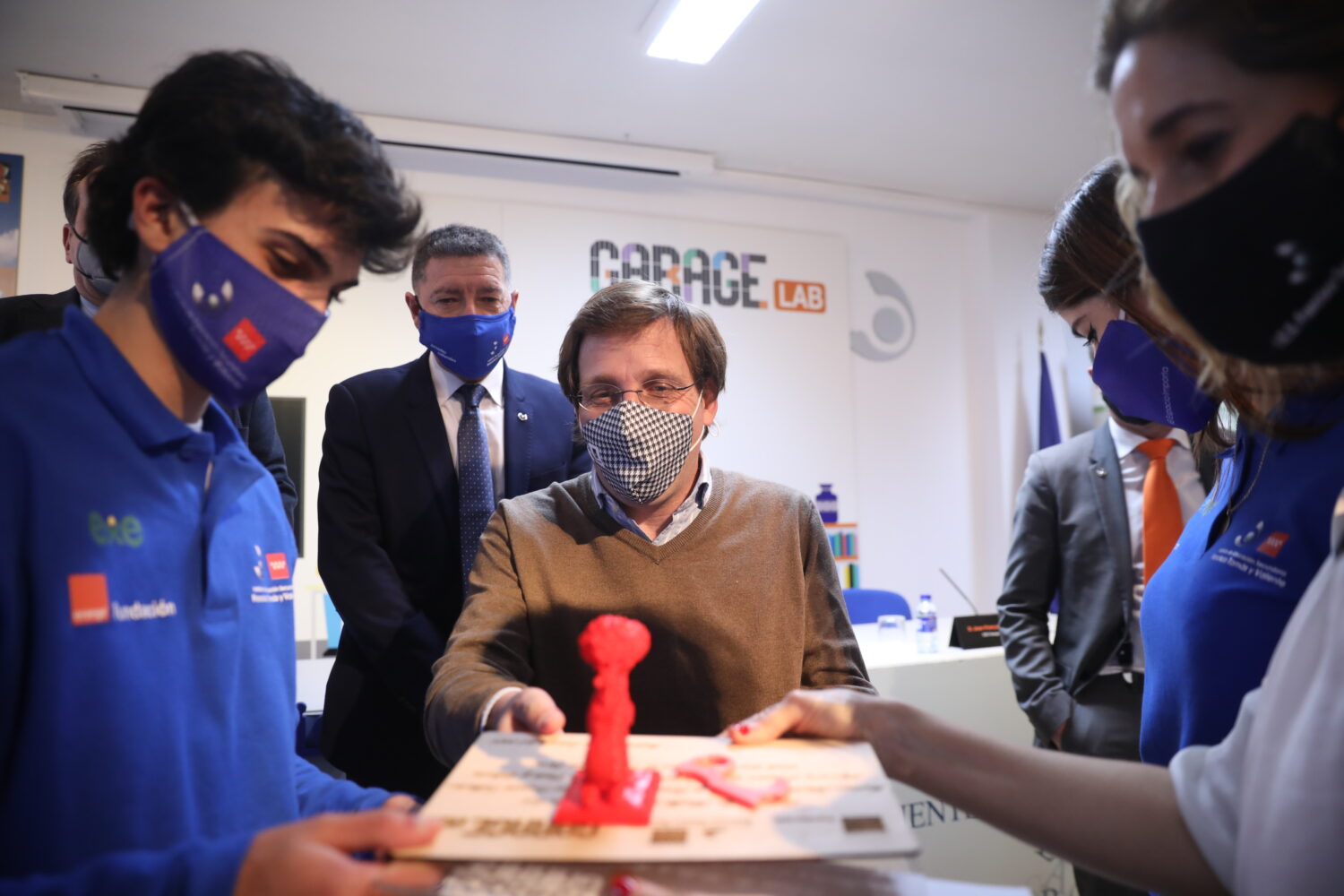 El alcalde de Madrid, José Luis Martínez-Almeida, ha asistido hoy, en el Instituto de Educación Secundaria Francisco Tomás y Valiente, a la presentación de un nuevo GarageLab, el programa formativo de la Fundación Orange que acerca espacios digitales a las escuelas de Segunda Oportunidad y de Formación Profesional.