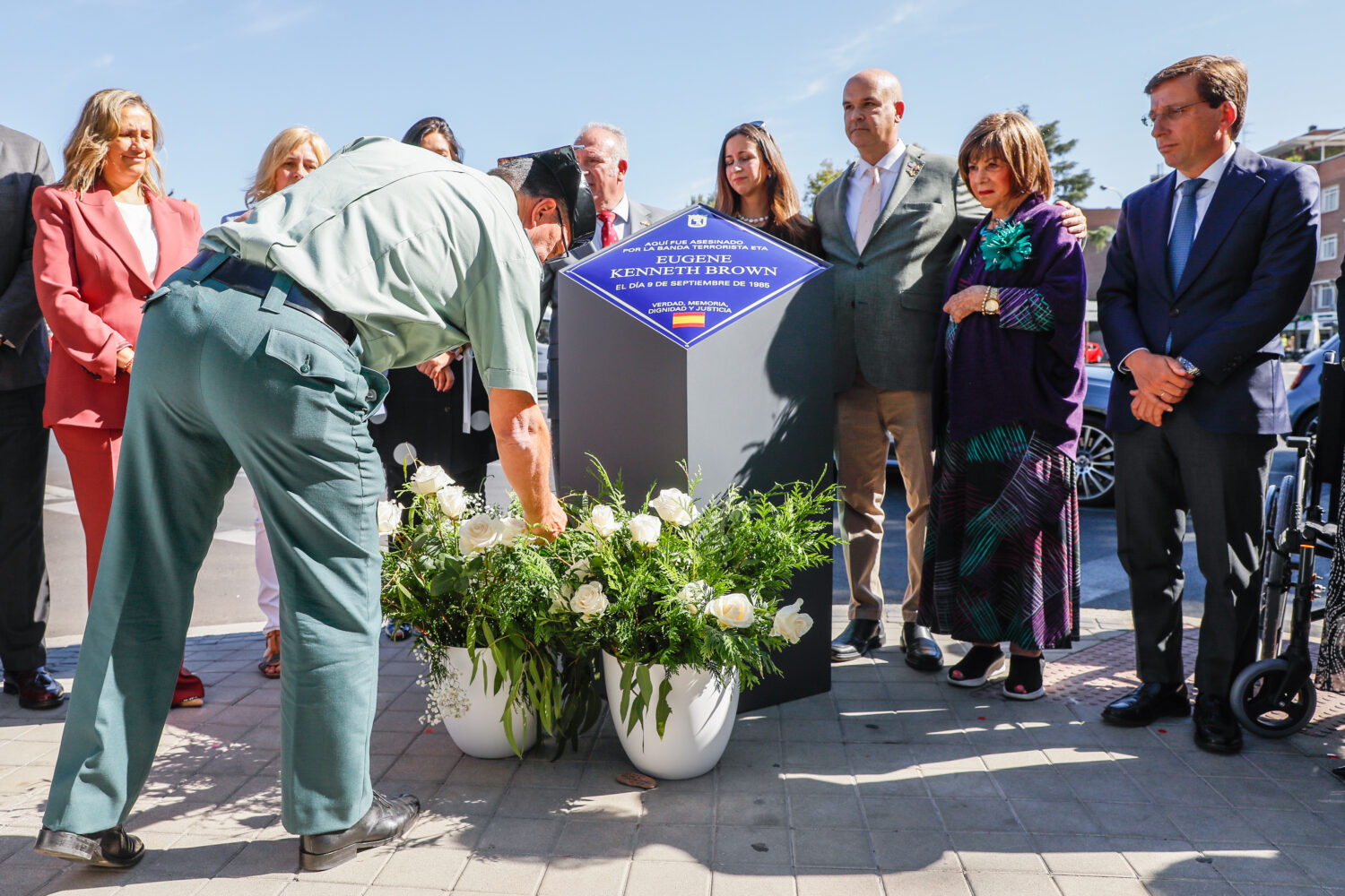 El alcalde de Madrid, José Luis Martínez-Almeida, ha descubierto hoy en la plaza de la República Argentina una placa en homenaje a Eugene Kenneth Brown, ciudadano estadounidense asesinado por la banda terrorista ETA el 9 de septiembre de 1985. Brown, trabajador de una multinacional estadounidense que se encontraba de viaje de negocios en Madrid, resultó herido de gravedad y falleció dos días más tarde a causa de la explosión de un coche bomba colocado por un comando de ETA al paso de un autobús de guardias civiles, entre los que hubo 16 heridos.