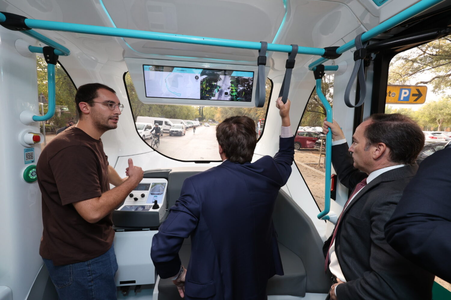 Imágenes de Almeida, Carabante y Fanjul durante su trayecto en el autobús autónomo de EMT Madrid en Casa de Campo