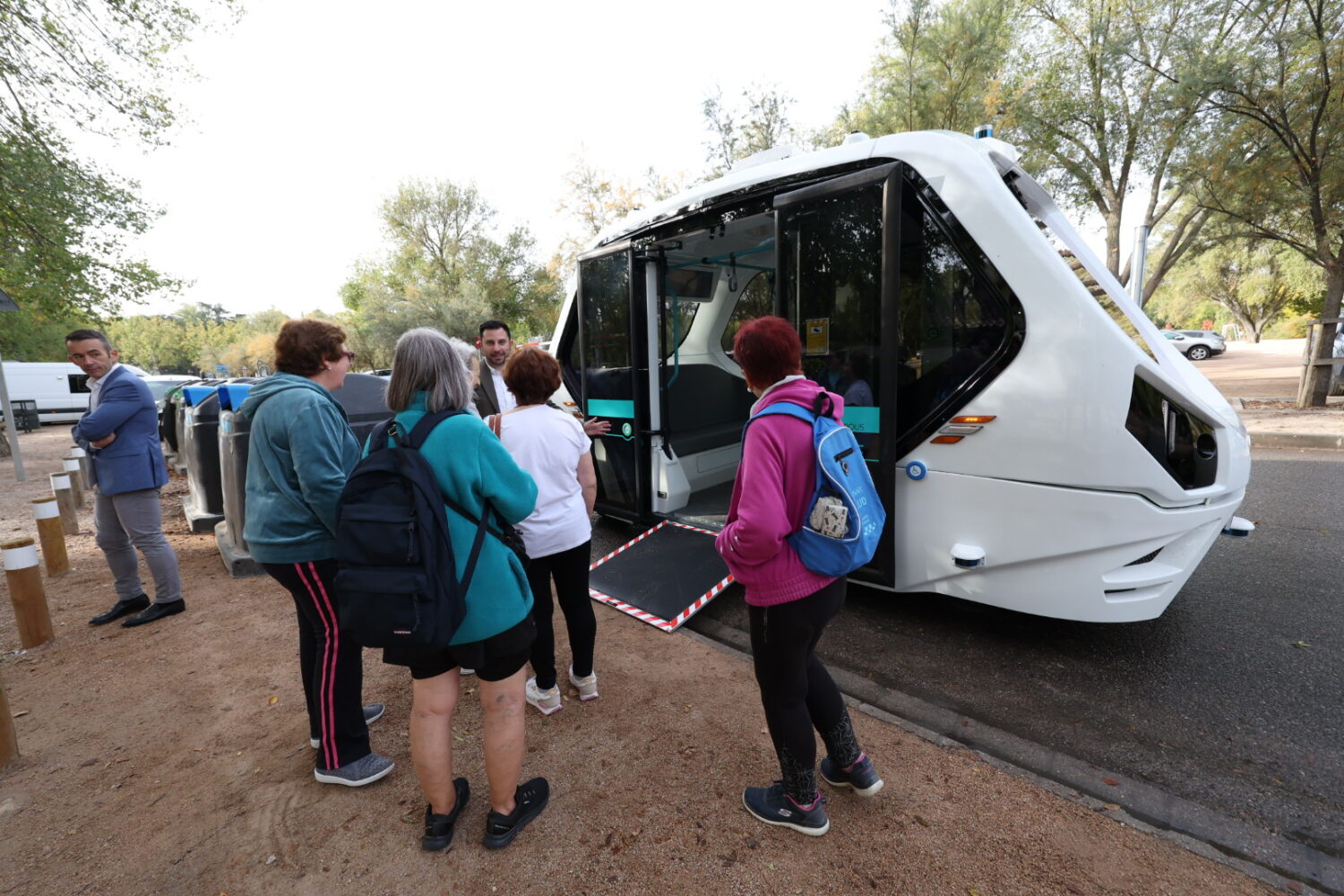 Imágenes, de izquierda a derecha: de usuarios probando autobús autónomo, interior vehículo y cartelería informativa exterior