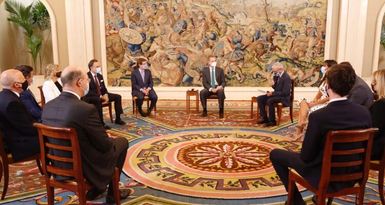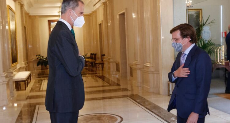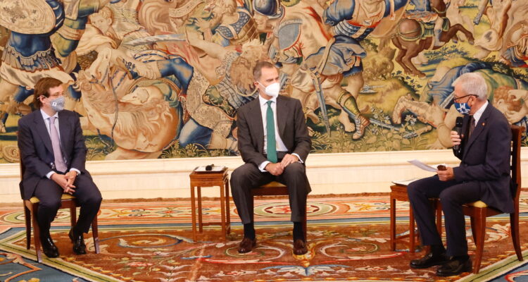 El alcalde de Madrid y presidente de honor de Madrid Futuro, José Luis Martínez-Almeida, y la vicealcaldesa y vicepresidenta de honor de esta entidad, Begoña Villacís, han asistido este mediodía a la audiencia ofrecida por el rey Felipe VI a la Junta Directiva de esta asociación sin ánimo de lucro integrada por empresas e instituciones de la sociedad civil y cuyo objetivo es impulsar la recuperación de la ciudad de Madrid y rediseñar su futuro tras la pandemia.