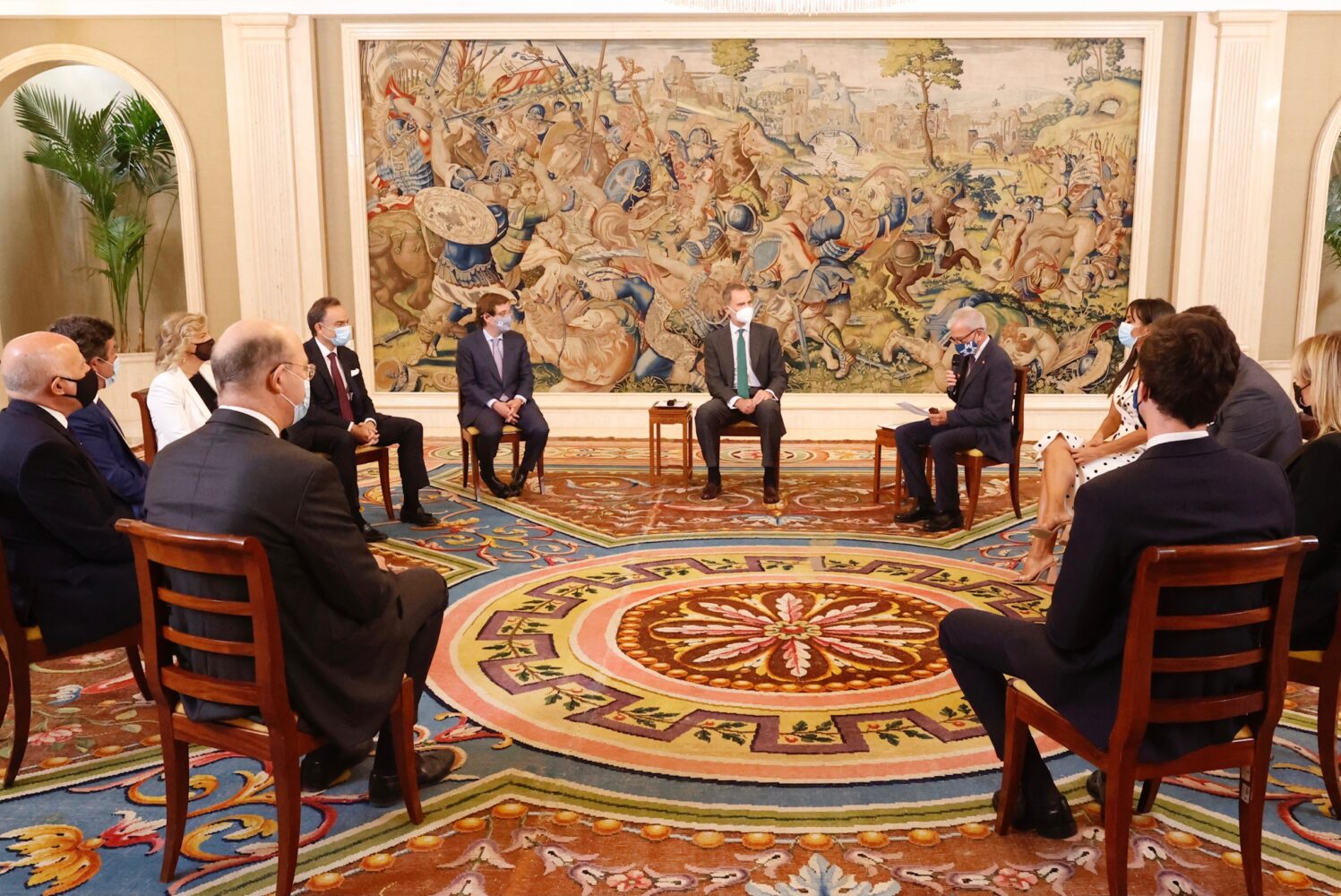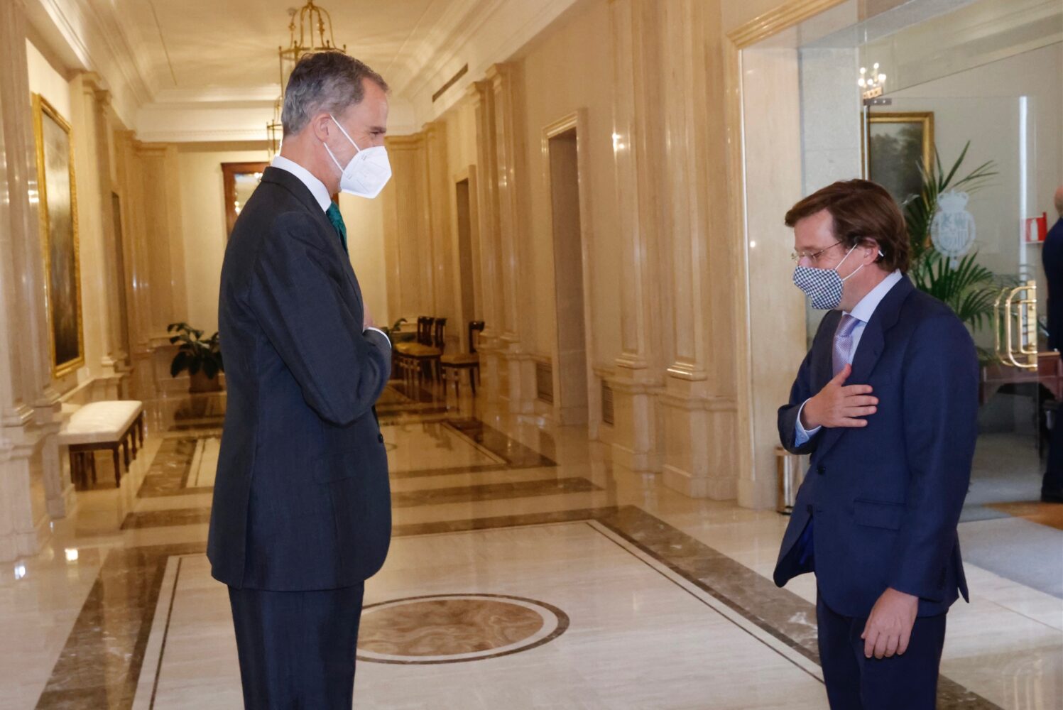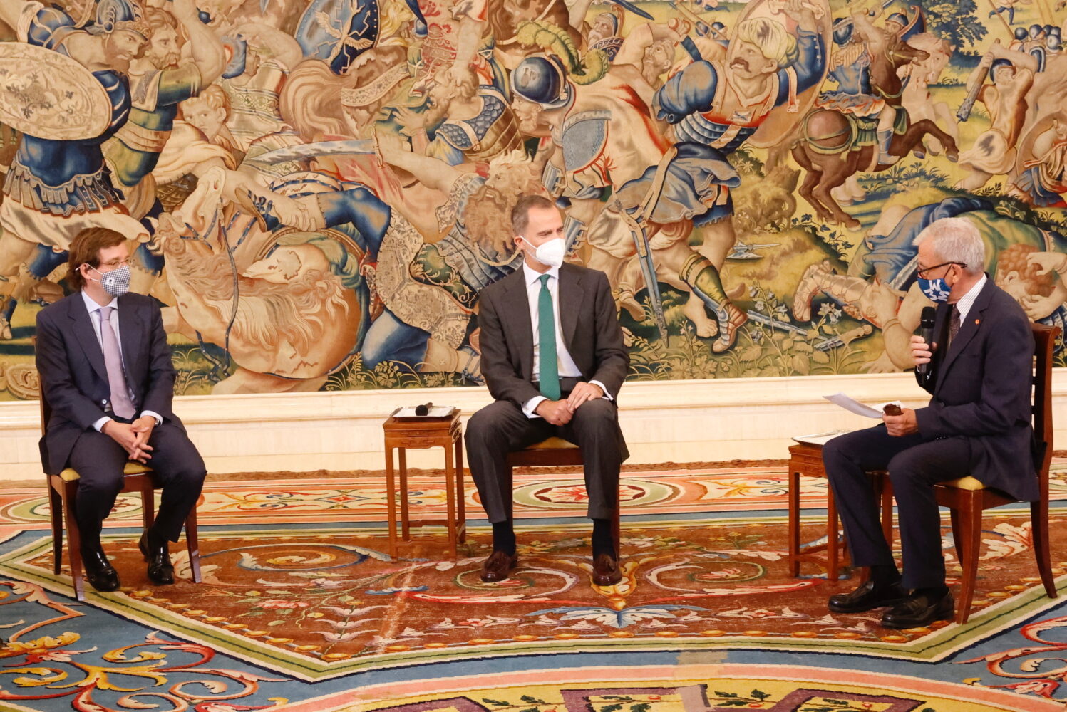 El alcalde de Madrid y presidente de honor de Madrid Futuro, José Luis Martínez-Almeida, y la vicealcaldesa y vicepresidenta de honor de esta entidad, Begoña Villacís, han asistido este mediodía a la audiencia ofrecida por el rey Felipe VI a la Junta Directiva de esta asociación sin ánimo de lucro integrada por empresas e instituciones de la sociedad civil y cuyo objetivo es impulsar la recuperación de la ciudad de Madrid y rediseñar su futuro tras la pandemia.
